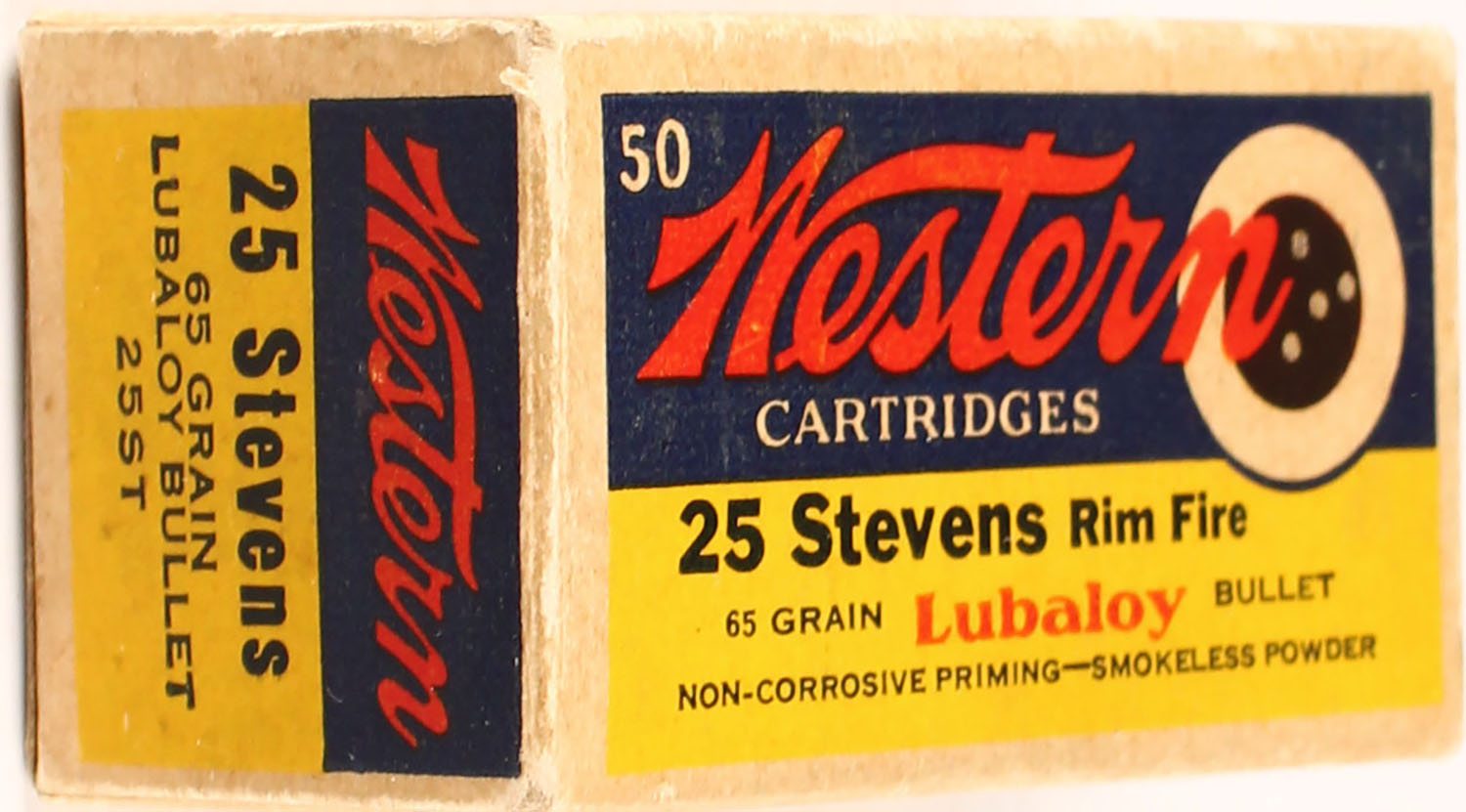 Western, .25 Stevens, 65 Grain Lubaloy Bullet, FULL, 1Pc., Blue yellow & red bulls eye box, box is solid, ammo is excellent. Grade: Excellent - Value: 50 to 150
