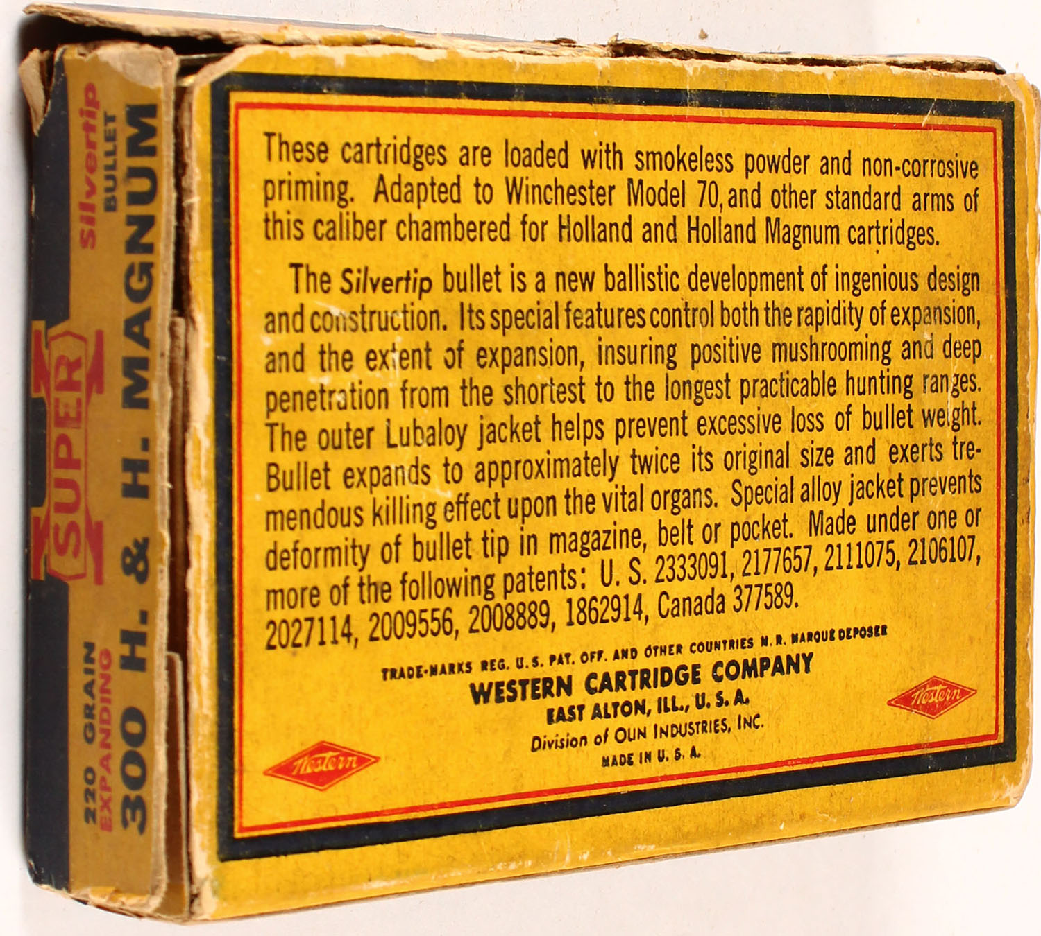 Western, Super-X, .300 H&H. Magnum, 220 Grain Silvertip Bullet, Controlled Expanding Bullet, Full, 1pc. Yellow blue & red Bear Box, box has scuffing, torn flaps and tears to box, edge & corner wear, ammo is excellent. Grade: Good - Value: 16 to 60