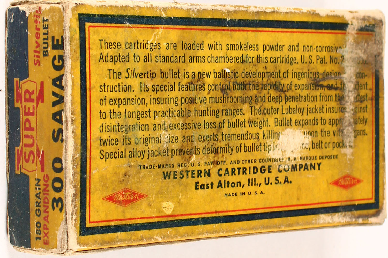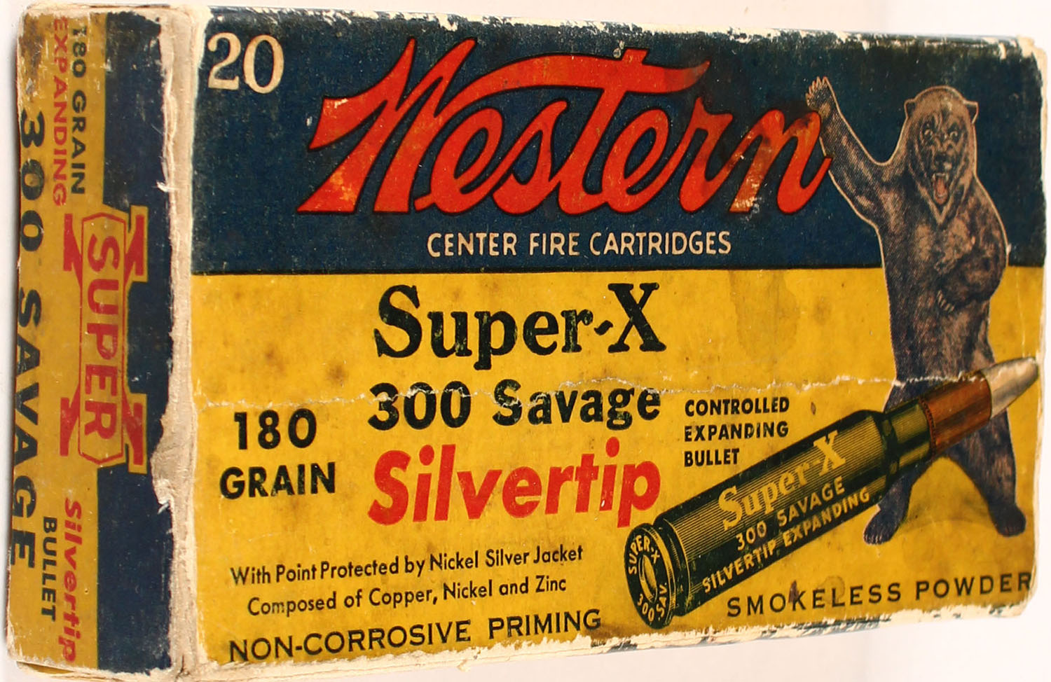 Western, Super-X, .300 Savage, 180 Grain Silvertip Bullet, Controlled Expanding Bullet, Full, 1pc. Yellow blue & red Bear Box, box has age soiling and scuffing, 1 flap is torn off, ammo is excellent. Grade: Very Good - Value: 20 to 80
