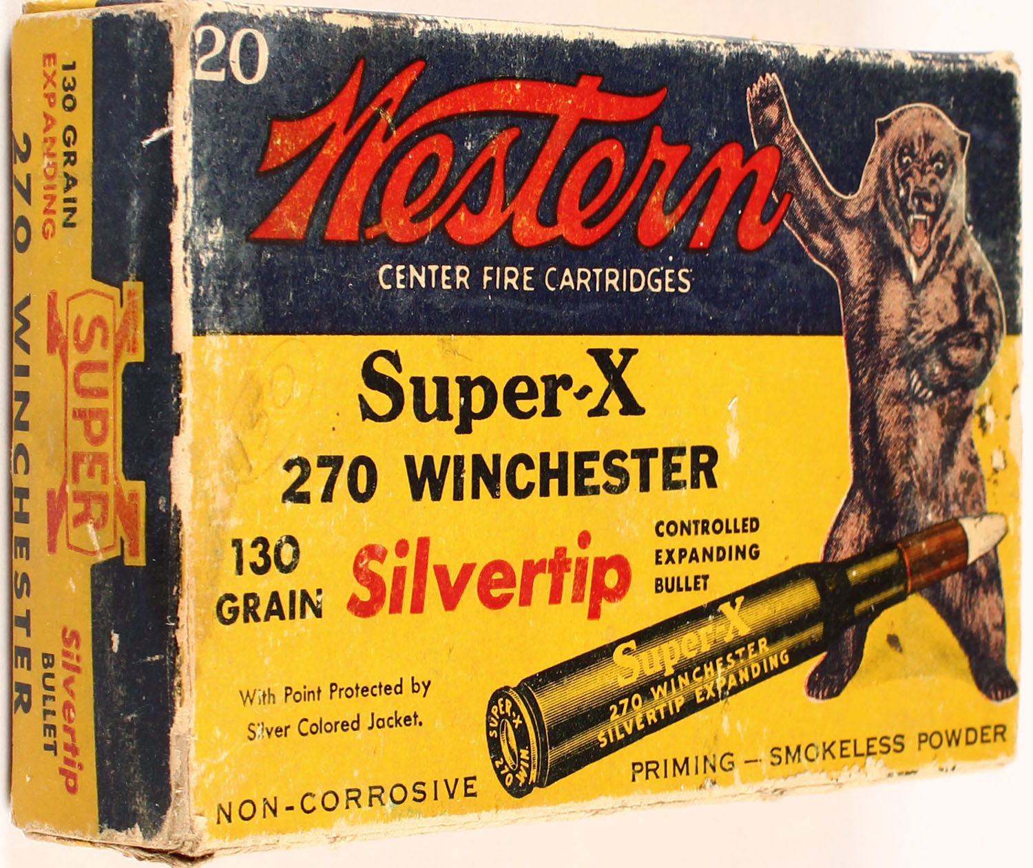 Western, Super-X, .270 Winchester, 130 Grain Silvertip Bullet, Controlled Expanding Bullet, Partial 10 rds., 1pc. Yellow blue & red Bear Box, box has scuffing and age soiling, ammo is very good. Grade: Very Good - Value: 6 to 60