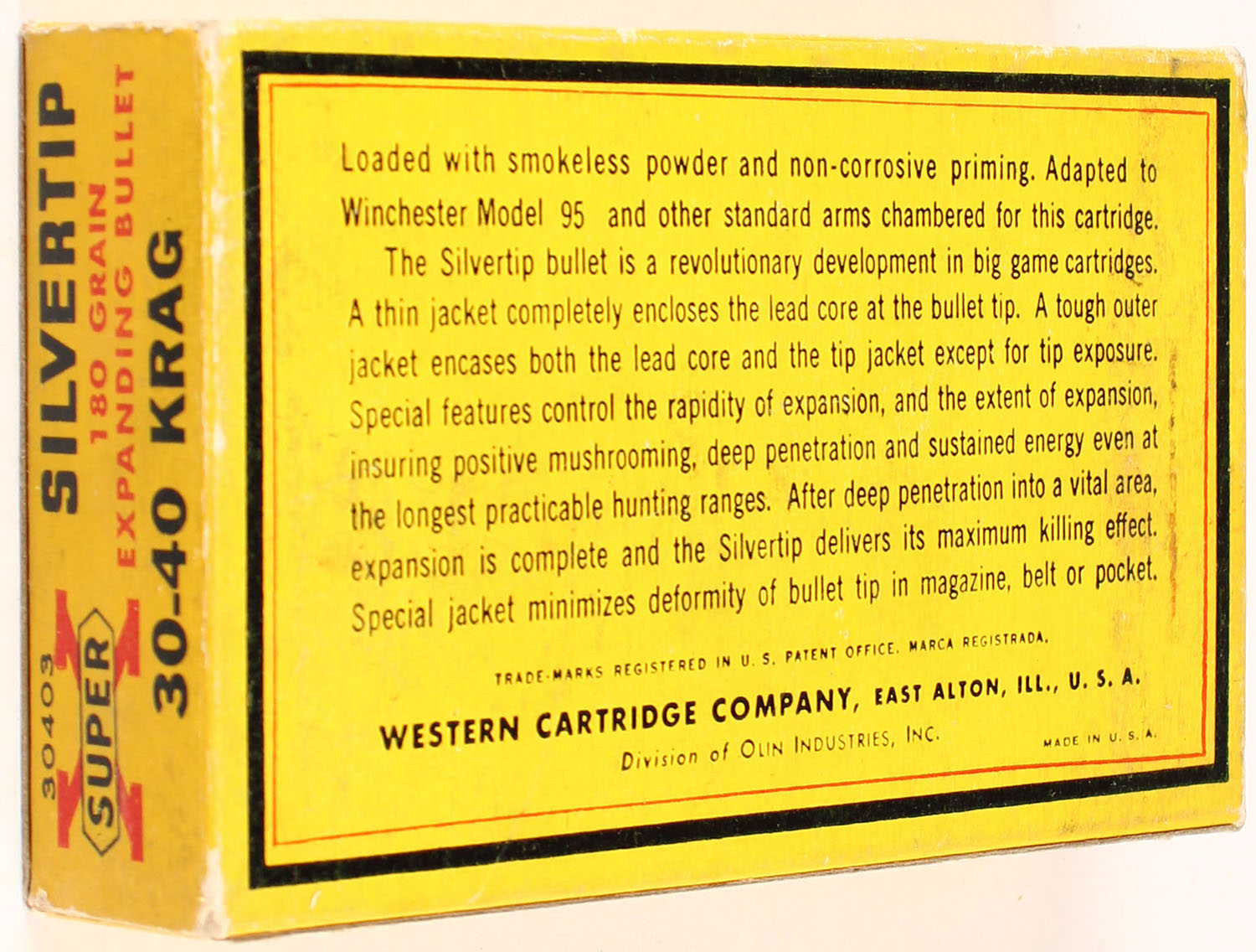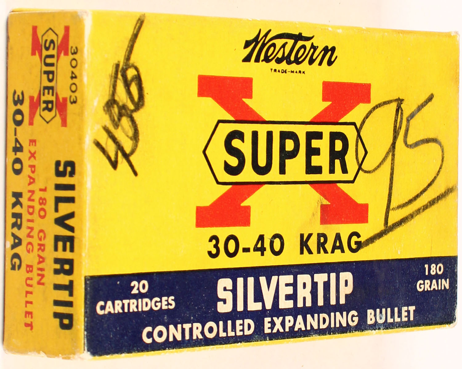 Western, Super-X, .30-40 Krag, 180 Grain Silvertip Bullet, Controlled Expanding Bullet, Full, 1pc. Yellow blue & red Box, box is solid with excellent color with some black pen markings, ammo is excellent. Grade: Excellent - Value: 40 to 80