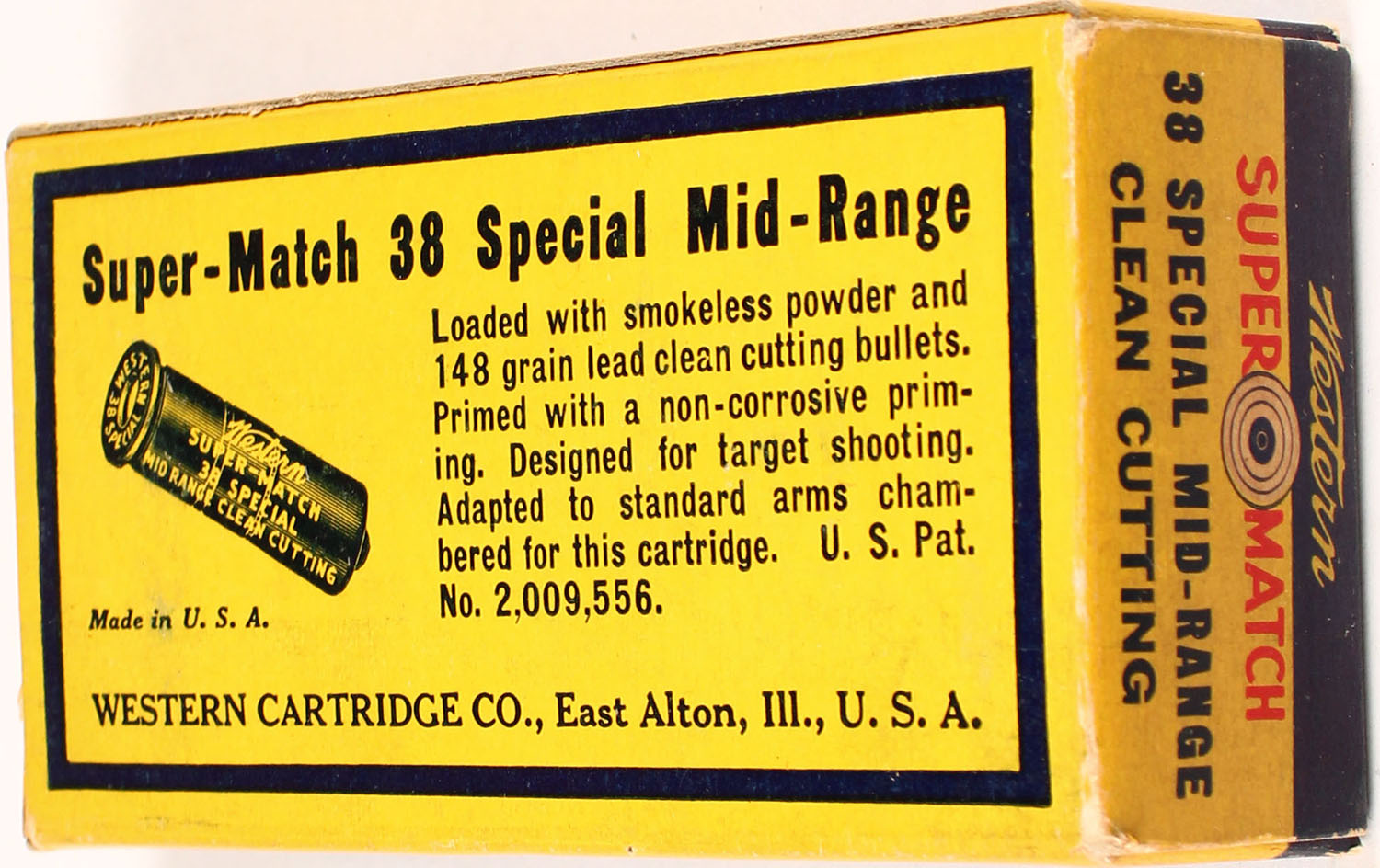 Western, Super Match, .38 Special Mid-Range, 148 Grain, Full, 1pc. Yellow blue & red Box, box 1 torn flap, minor scuffing, ammo is excellent. Grade: Excellent - Value: 40 to 150