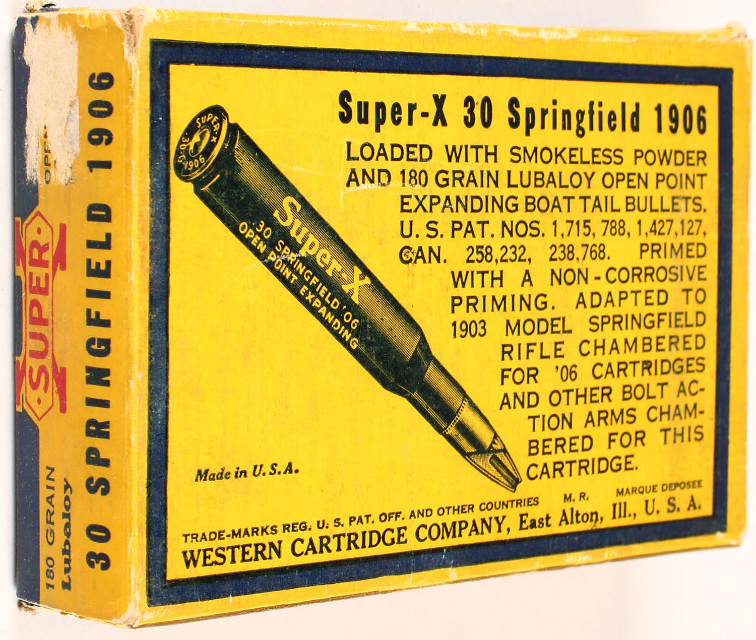 Western, Super-X, .30 Springfield 1906, 180 Grain Lubaloy Bullet, Full, 1pc. Yellow blue & red box, box is solid with scuffing, ammo is excellent. Grade: Excellent - Value: 40 to 100