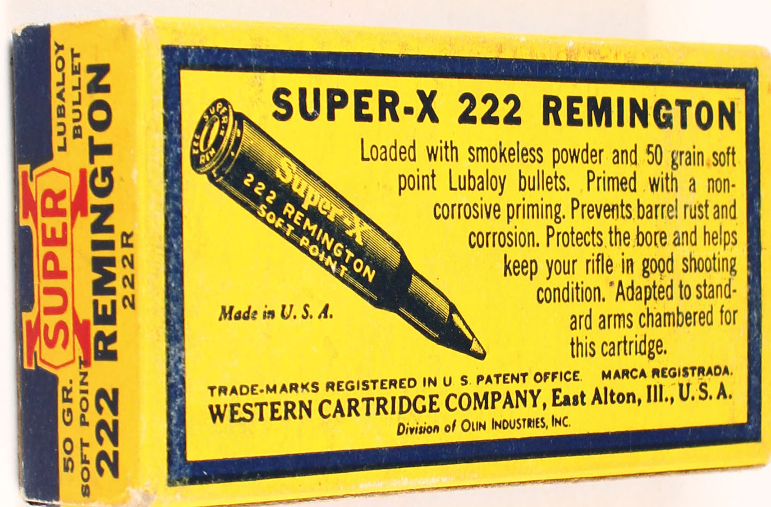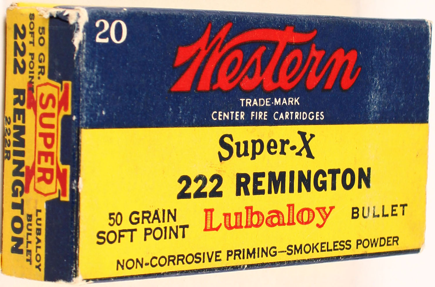 Western, Super-X, .222 Rem, 50 Grain Lubaloy Bullet, Full, 1pc. Yellow blue & red box, box is solid with excellent color, ammo is excellent. Grade: Excellent ++ - Value: 30 to 100