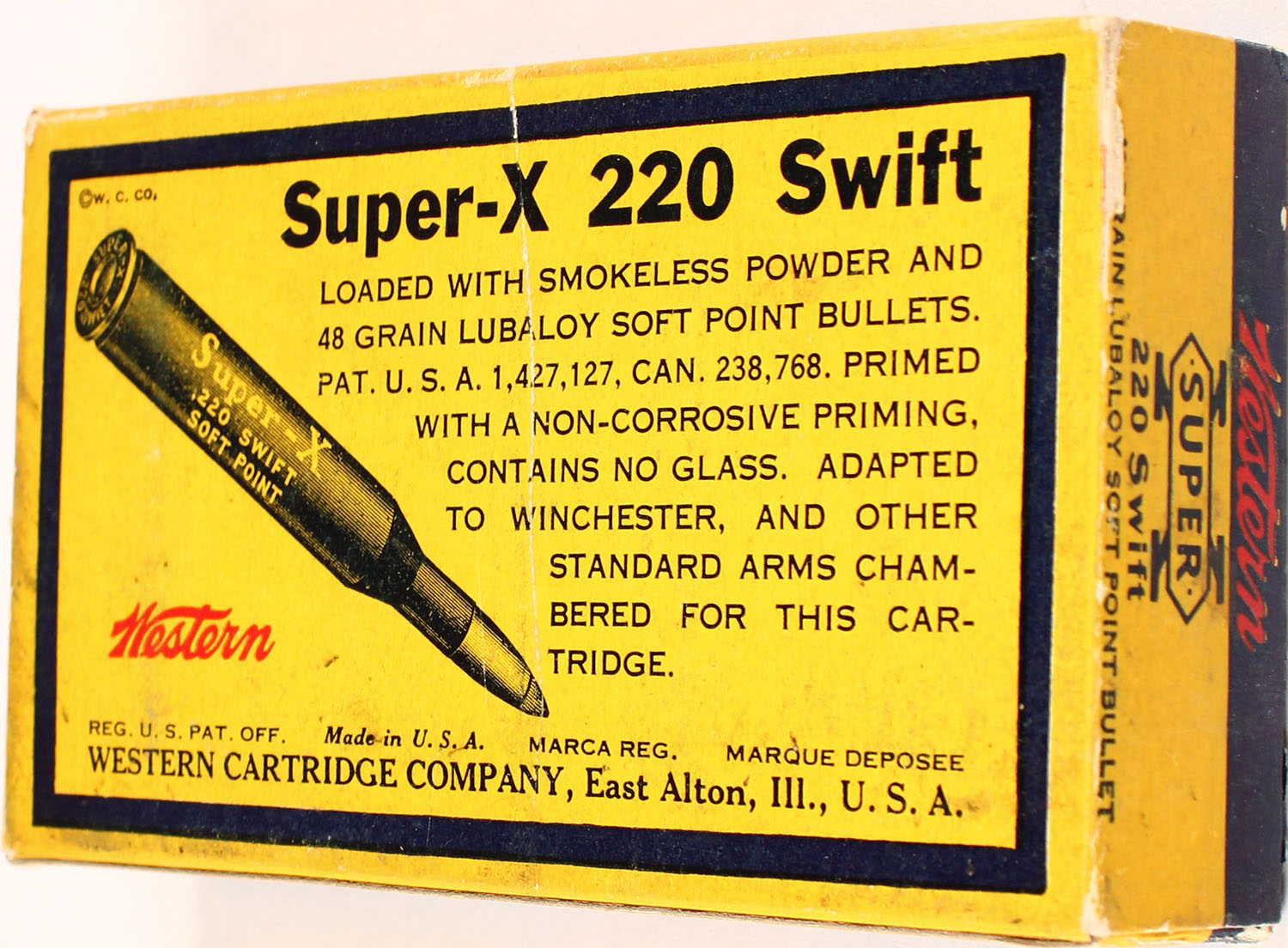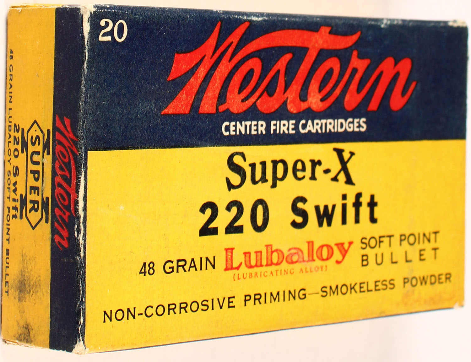 Western, Super-X, .220 Swift, 48 Grain Lubaloy Bullet, Full, 1pc. Yellow blue & red box, box is solid with minor scuffing, ammo is excellent. Grade: Excellent - Value: 50 to 150