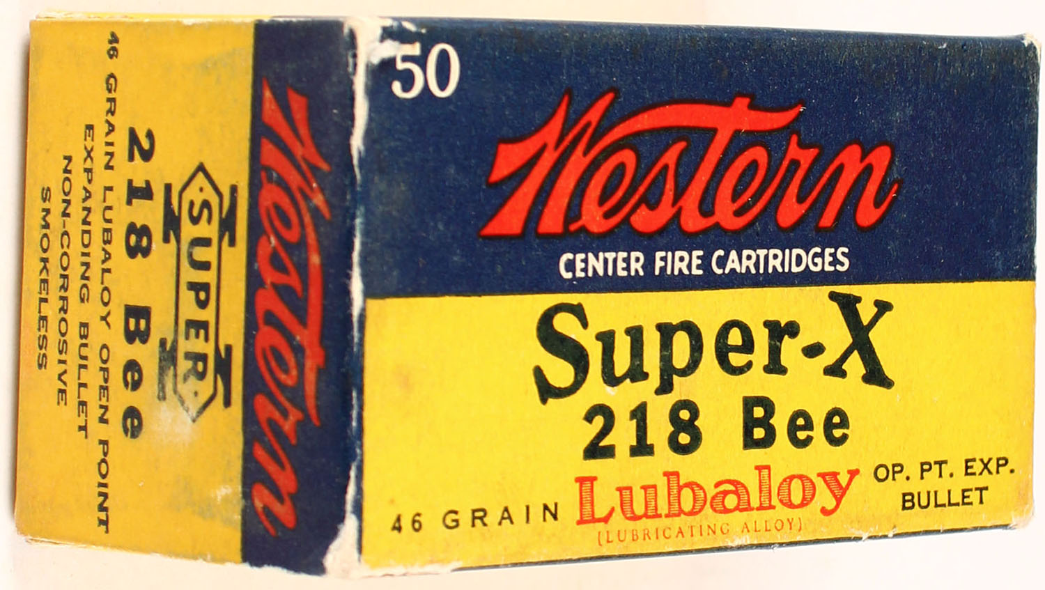 Western, Super-X, .218 Bee, 46 Gr. LUBALOY OP. PT. EXP. Bullet, Smokeless, 1pc, Full, blue/yellow box with black/red print, box is solid with rub marks, & light edge/corner wear, ammo is very good. Grade: Excellent - Value: 100 to 200