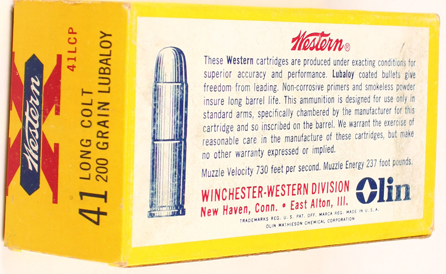 Western, Super-X, .41 Long Colt, 200 Gr. Lubaloy Inside lubricated Bullet, 1pc, Full, yellow box with white label & black/red/blue print, box is solid with light rub marks & very light corner wear, ammo is excellent Grade: Excellent + - Value: 100 to 200