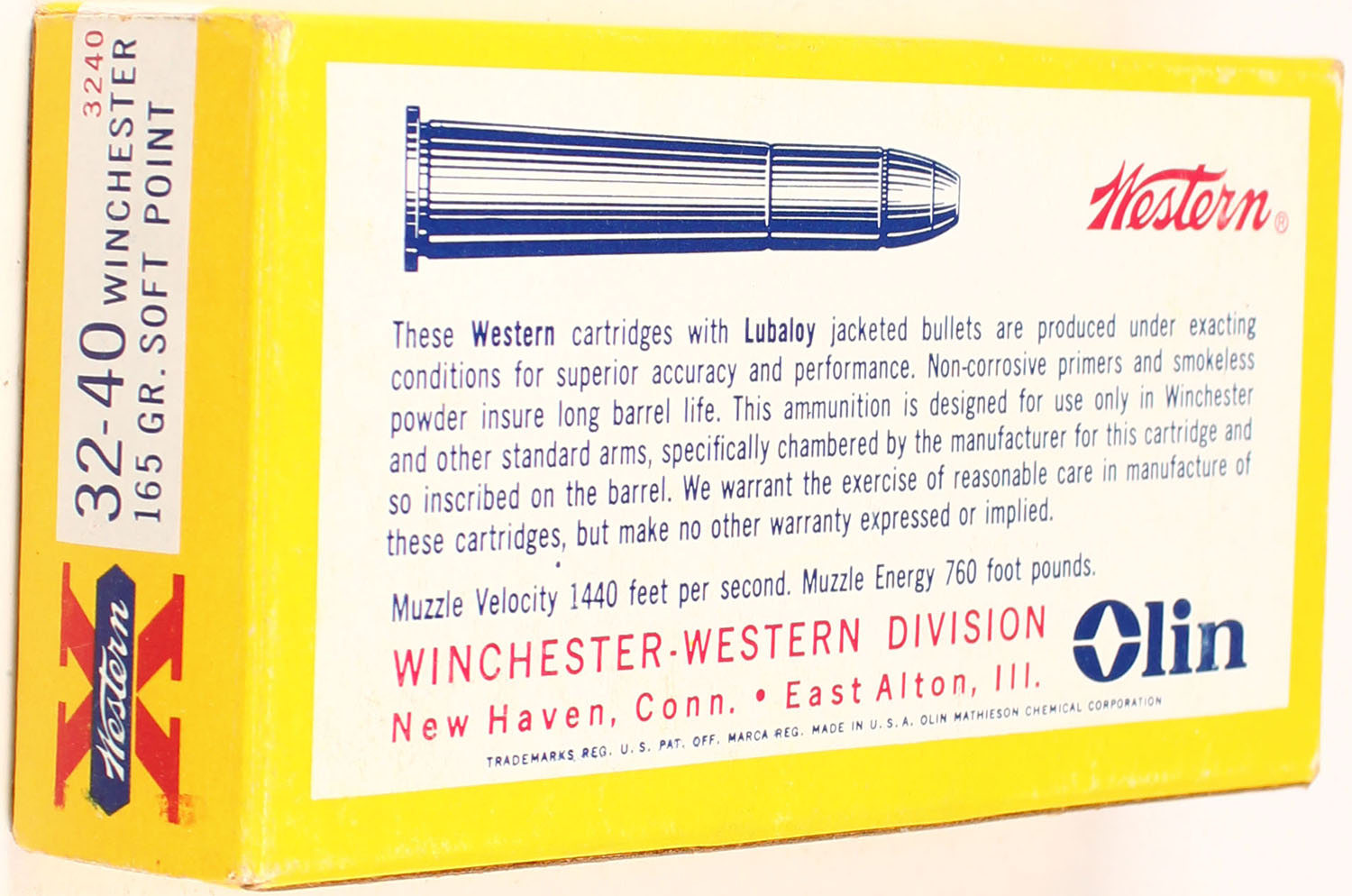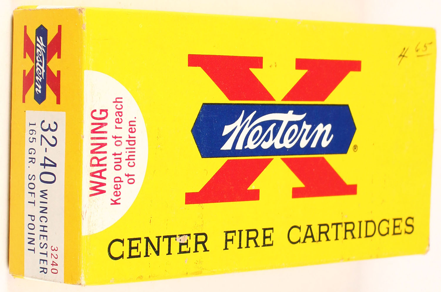 Western, Super-X, .32-40 Winchester, 165 Gr. Soft Point Bullet, 1pc, Full, yellow box with white label & black/red/blue print, box is solid with light rub marks & pen marks, ammo is excellent. Grade: Excellent - Value: 50 to 100