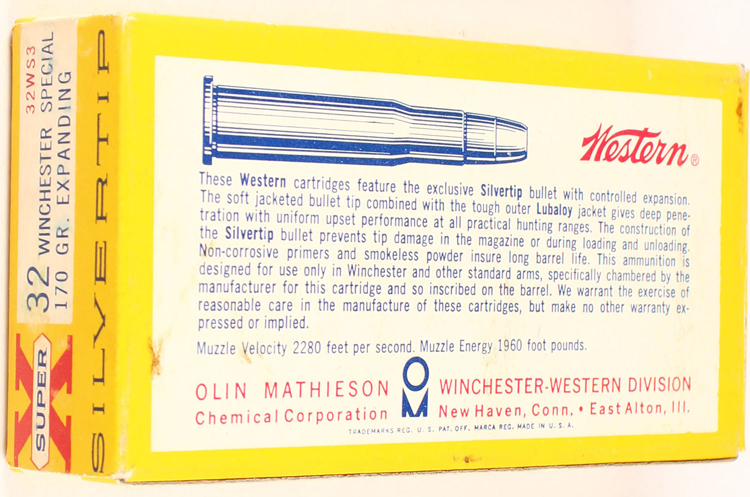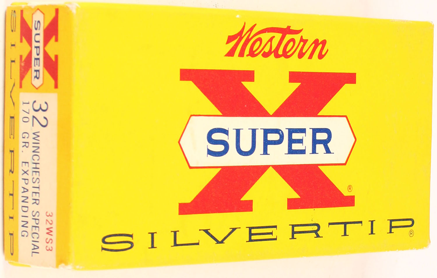 Western, Super-X Silvertip, .32 Winchester Special, 170 Gr. EXP. Bullet, 1pc, Full, yellow box with white label & black/red/blue print, box is solid with light rub wear & light edge wear, ammo is excellent. Grade: Excellent + - Value: 40 to 80