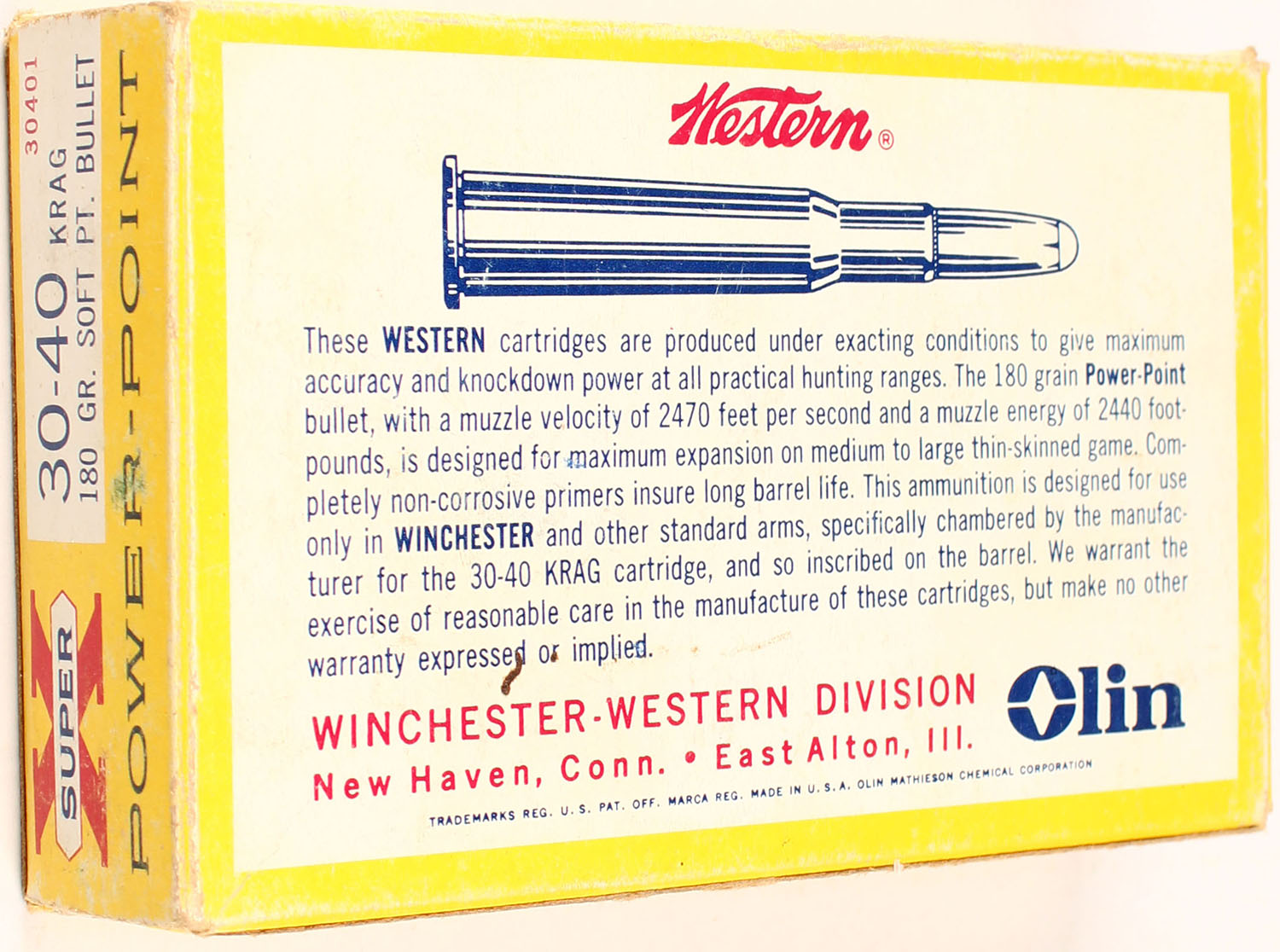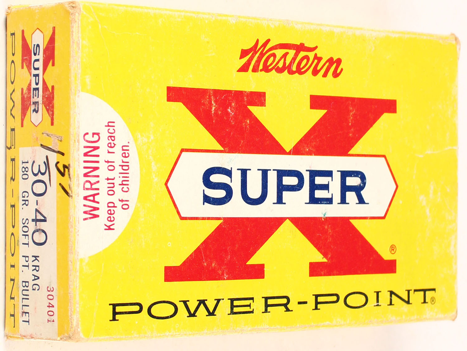 Western, Super-X Power-Point, .30-40 Krag, 180 Gr. Soft PT. Bullet, 1pc, Full, box is solid with rub marks, light edge wear & pen marks, ammo is excellent. Grade: Excellent - Value: 30 to 90