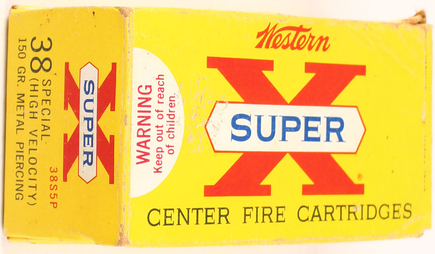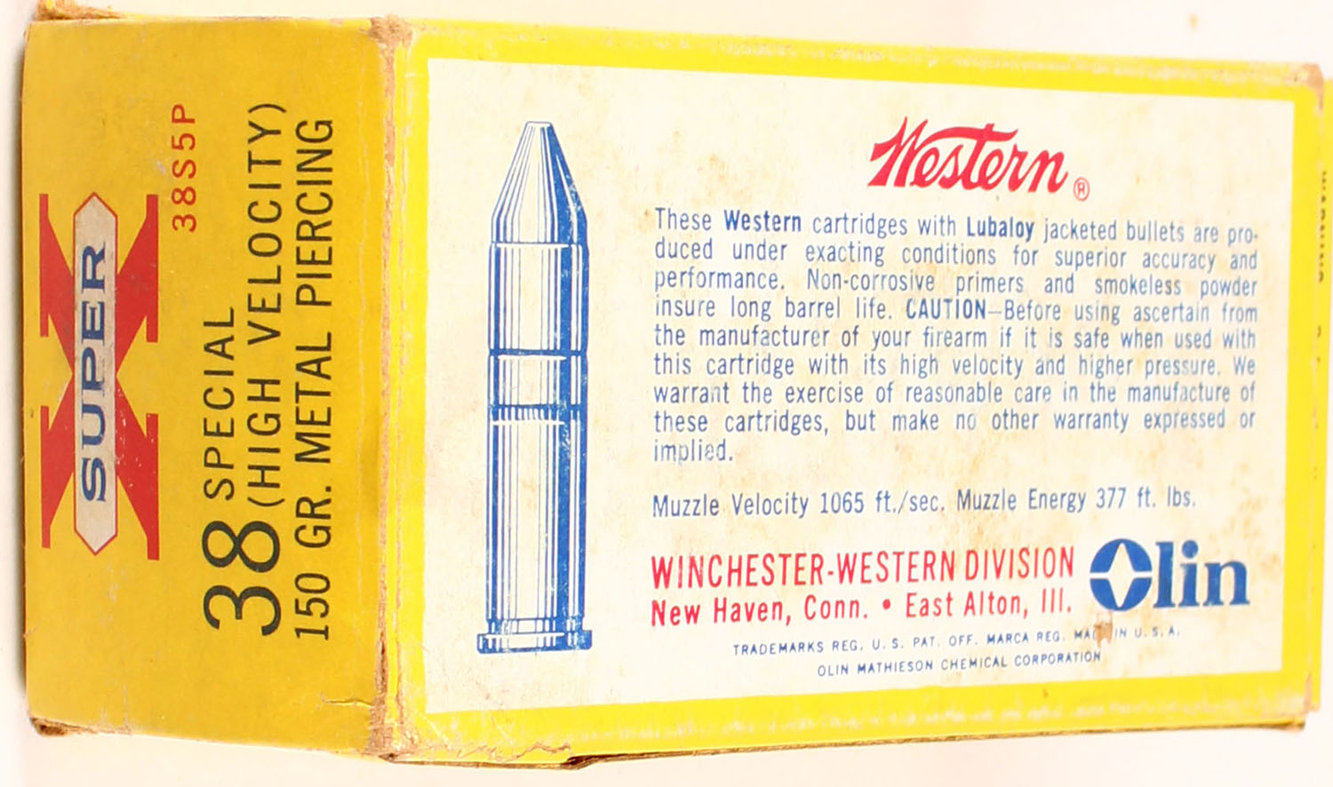 Western, Super-X, .38 Special High Velocity, 150 Gr. Metal Piercing Bullet, Nickel Plated Case, 1pc, Full, yellow box with white label & black/red/blue print, box is solid with rub marks, edge/corner wear, & light handling wear, ammo is excellent. Grade: Very Good ++ - Value: 100 to 200