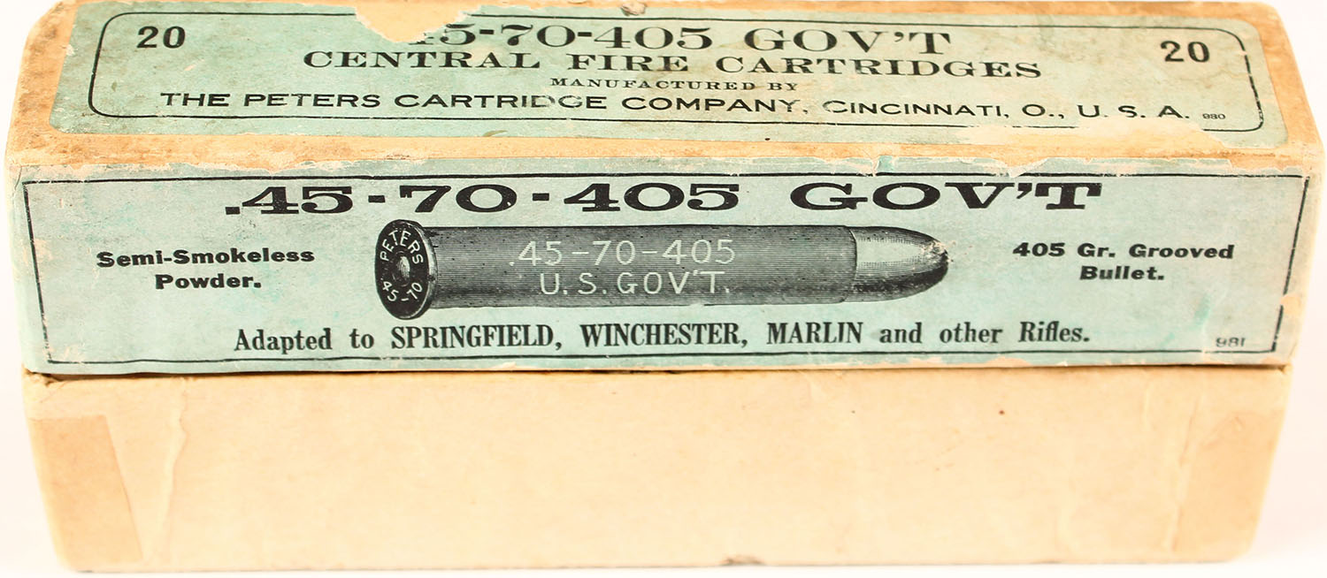 Peters, .45-70-405 Gov't, Semi-Smokeless Powder, 2pc, FULL & SEALED, buff box with blue label & black print, box is solid with two tears in top label, light rub wear, light edge wear, & light age soiling. Grade: Very Good ++ - Value: 50 to 100