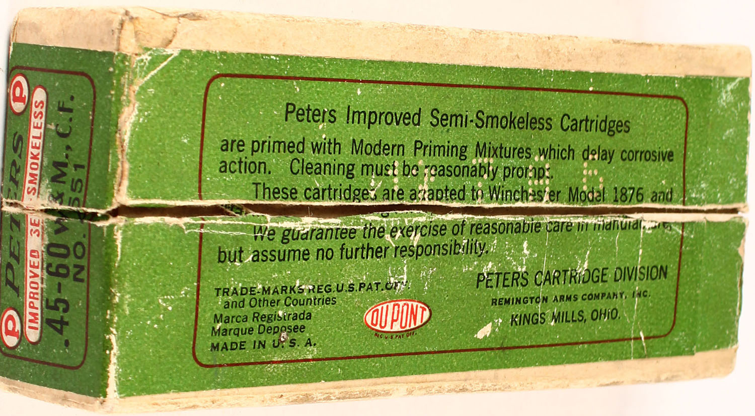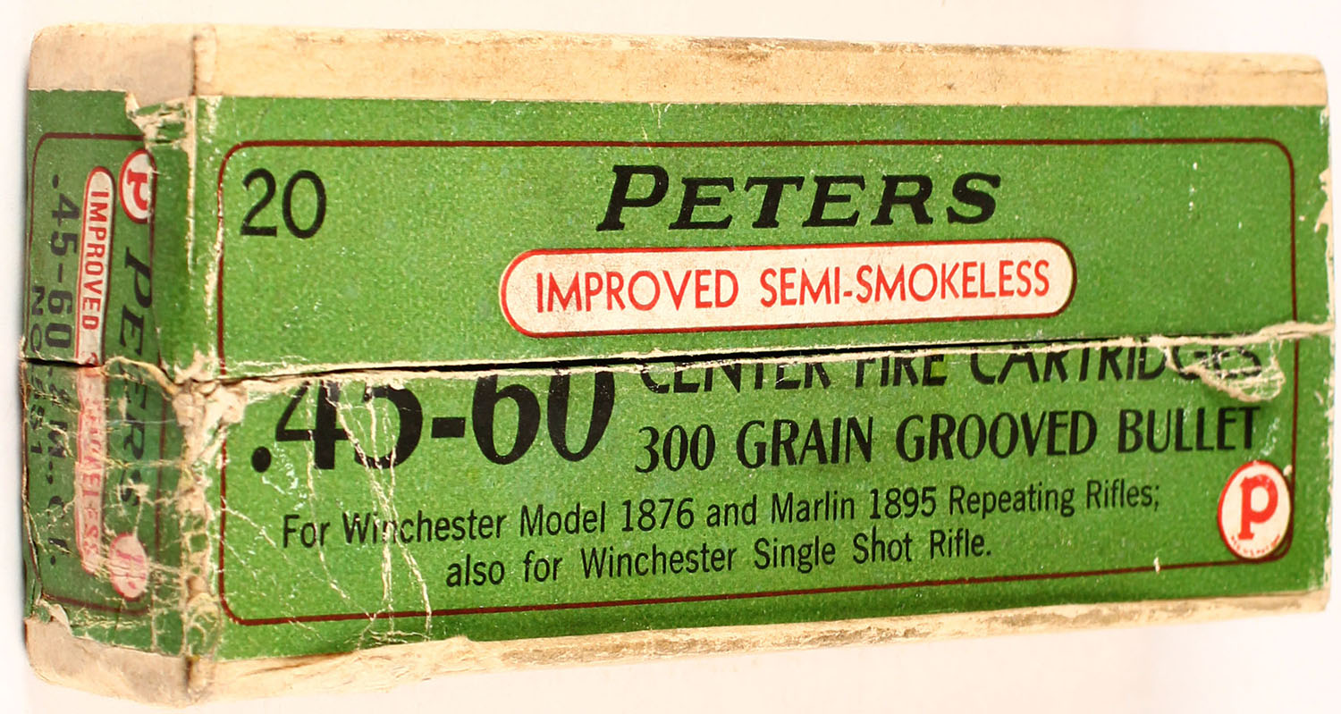 Peters, .45-60, 300 Gr. Grooved Bullet, Improved Semi-Smokeless powder, 2pc, FULL & SEALED, buff box with green/white label & black/red print, box is solid with rub marks, edge wear, light age soiling, & light handling wear. Grade: Very Good + - Value: 50 to 150