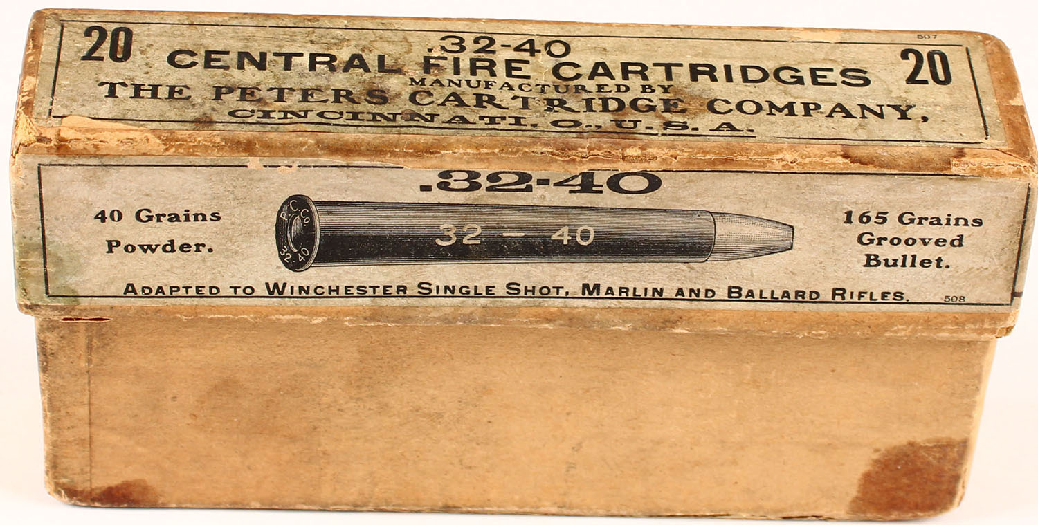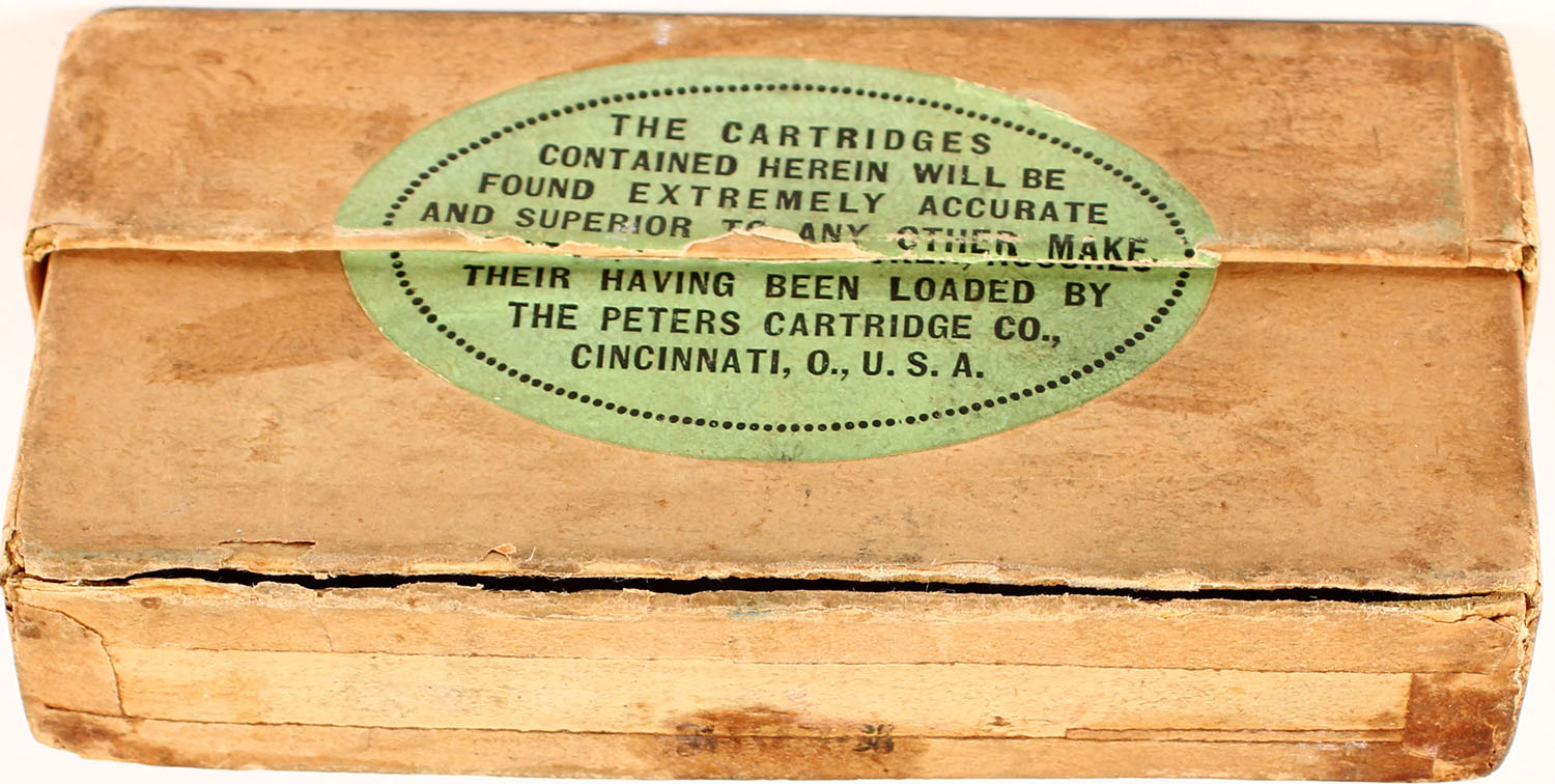 Peters, .32-40, 165 Gr. Grooved Bullet, semi-smokeless powder, 2pc, Full, buff box with green/blue label & black print, box is solid with one seam slip on bottom seam, old hardware store sticker on right end, age soiling, rub marks, & edge/corner wear, ammo is excellent. Grade: Very Good - Value: 40 to 80