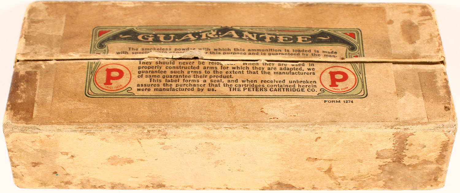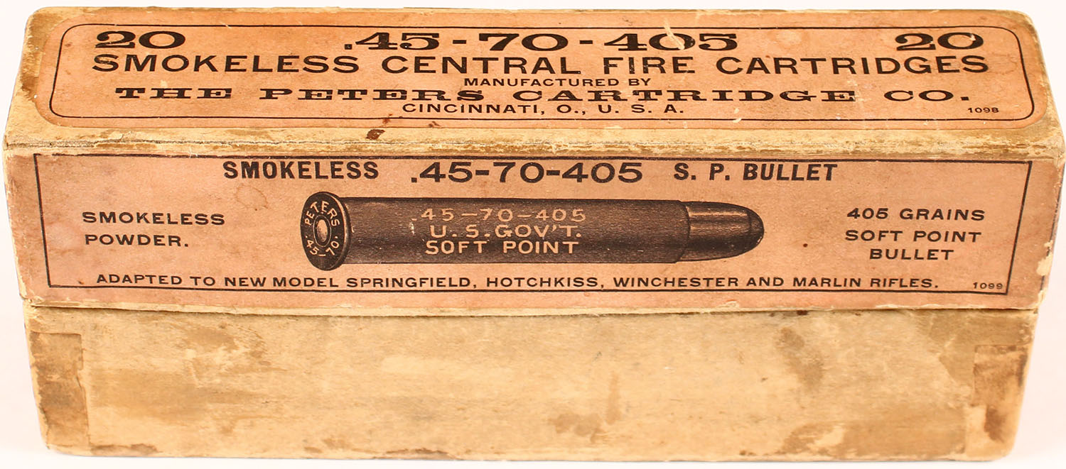 Peters, .45-70-405 U.S.Gov't, Soft Point Bullet, smokeless powder, 2pc, partial 15 Rds. 2 correct 13 with wrong bullet, buff box with salmon label & black print, box is solid with light age soiling, light rub wear & edge wear, ammo ranges from very good to good. Grade: Excellent - Value: 30 to 60