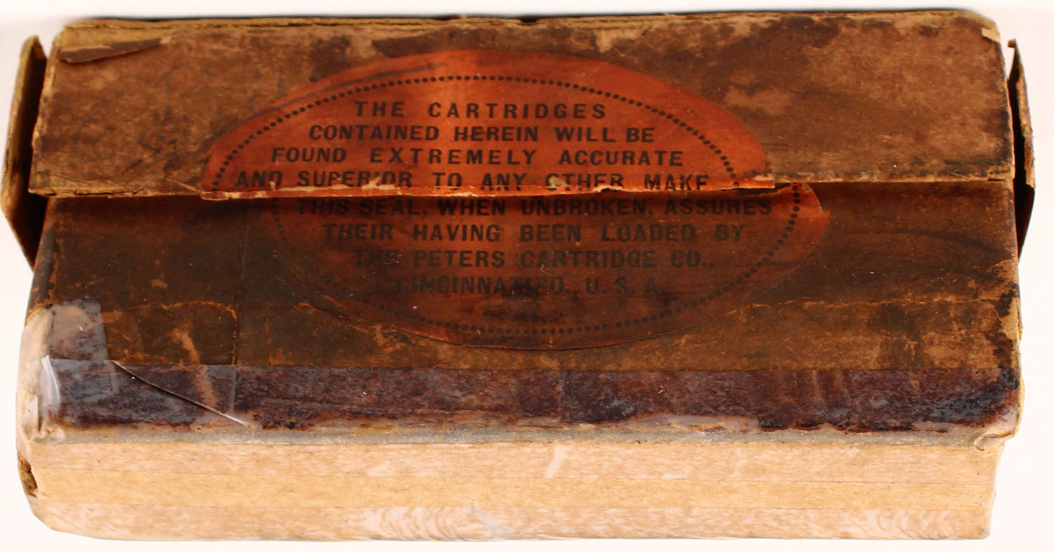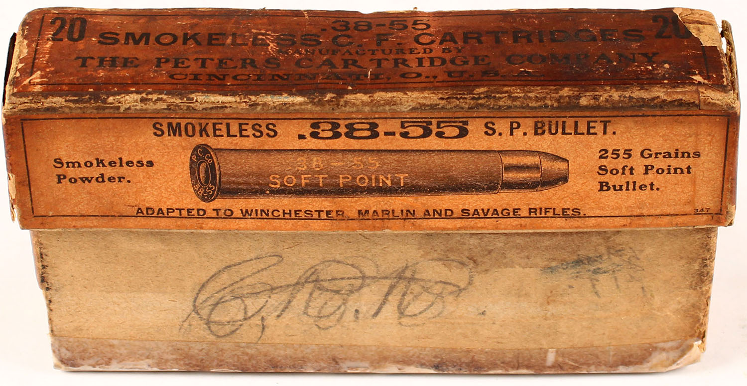 Peters, .38-55, 255 Gr. Soft Point Bullet, Smokeless Powder, 2pc, partial 14 Rds. One extra shot Rd. inside, buff box with orange label & black print, box has four split seams on lid, tape repairs on bottom seams, hold on bottom left end of box, age soiling, pencil marks, rub wear & edge wear, ammo is very good. Grade: Good + - Value: 50 to 200