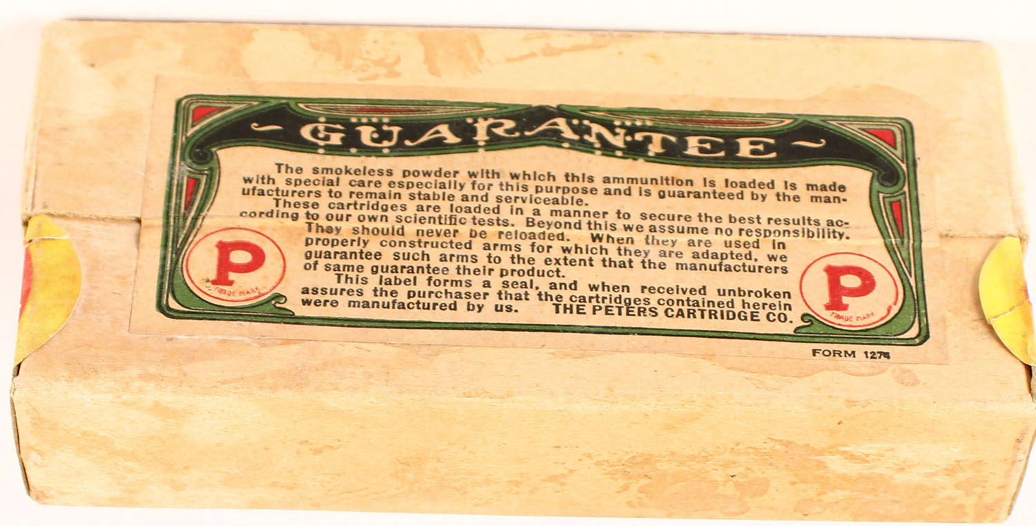 Peters, .22 High Power, 70 Gr. Soft Point Bullet, Smokeless Powder, 2pc, FULL & SEALED, buff box with white/red/yellow label & black print, box is solid with light age soiling, & light rub wear. Grade: Excellent - Value: 150 to 300