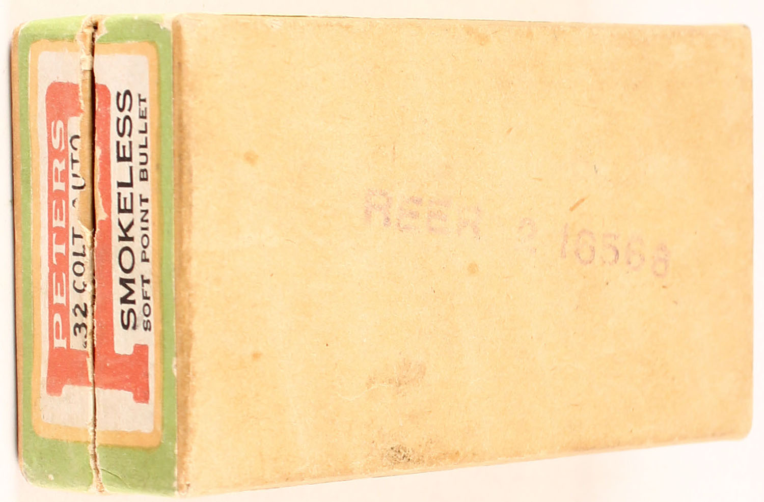 Peters, .32 Colt Automatic, Soft Point Bullets, smokeless, 2pc, Partial 47 Rds., buff box with buff/red/green label & black print, box is solid with small tear in left end label, light rub marks & light edge/corner wear, ammo is very good. Grade: Excellent + - Value: 20 to 60