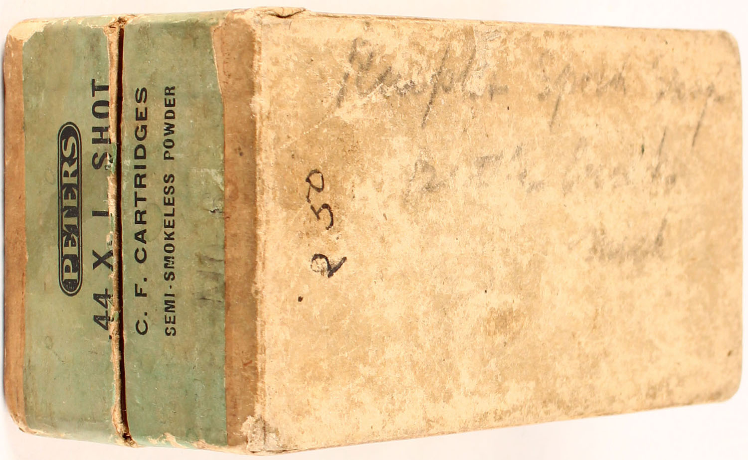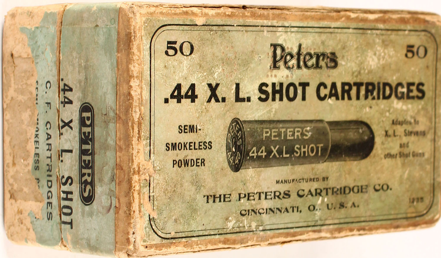 Peters, .44-40 X. L. Shot Cartridges, semi-smokeless powder, 2pc, Full with some having copper color primers & some having silver color primers, buff box with green label & black print, box is solid with age soiling, tears in label, rub marks, & edge/corner wear, ammo is good. Grade: Very Good ++ - Value: 100 to 300