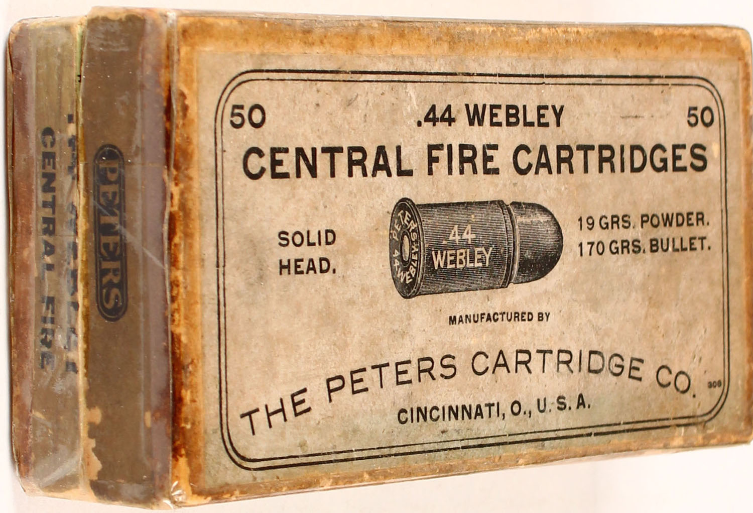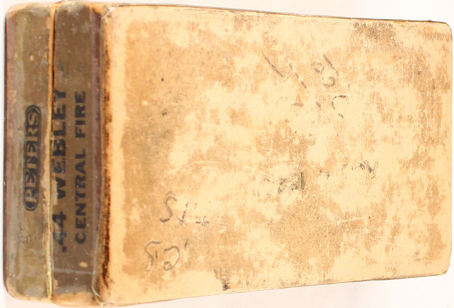 Peters, .44 Webley, 170 Gr. Bullet, 19 Grs. Of powder, solid head, 2pc, Partial 45 Rds., buff box with gray/green label & black print, box is solid with plastic covering/tape all over box, light age soiling, light rub marks & edge wear, ammo is fair. Grade: Very Good ++ - Value: 30 to 120