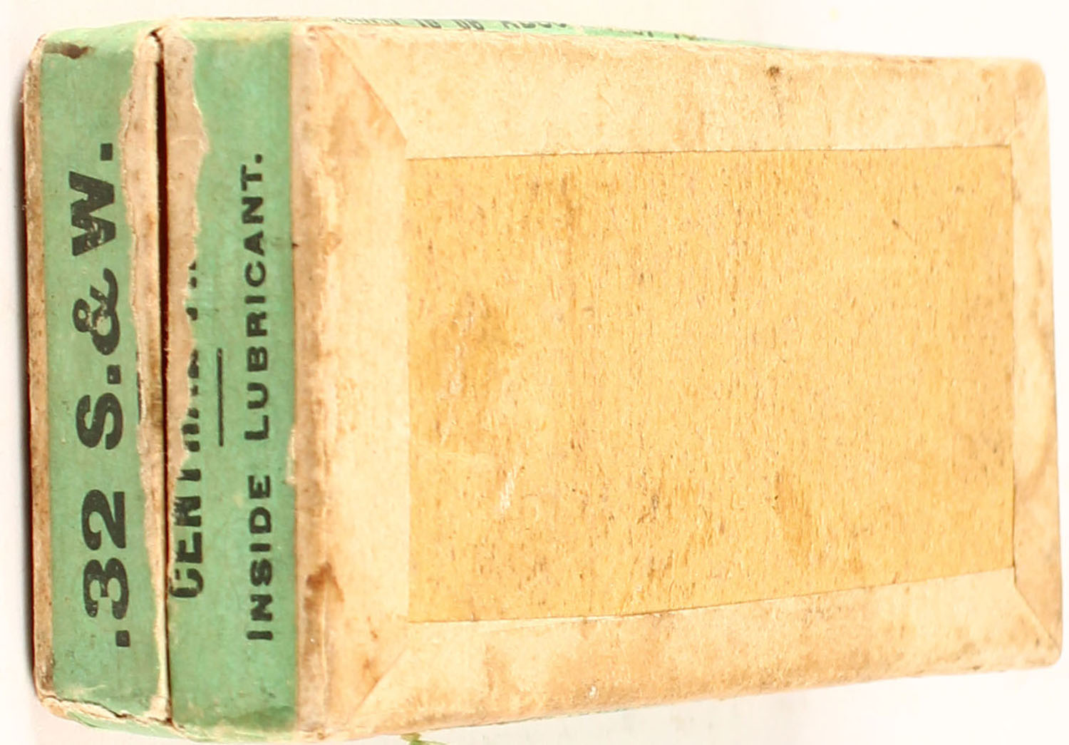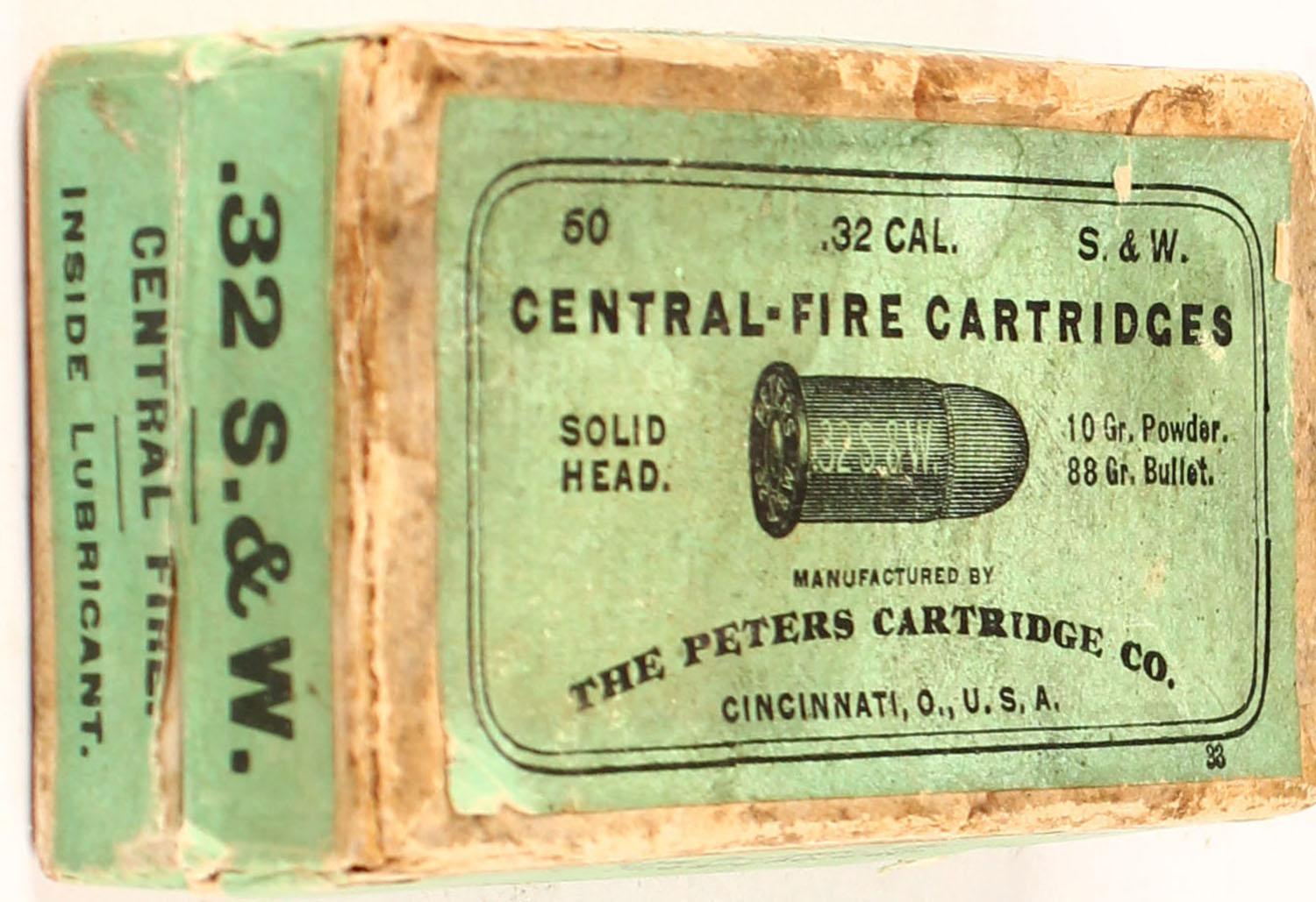 Peters, .32 S.&W., 88 Gr. Inside lubricated Bullet, 10 Grs. of powder, solid head, 2pc, Full, buff box with green label & black print, box is solid with age soiling, rub marks, & edge wear, ammo ranges from very good to good. Grade: Very Good ++ - Value: 10 to 60