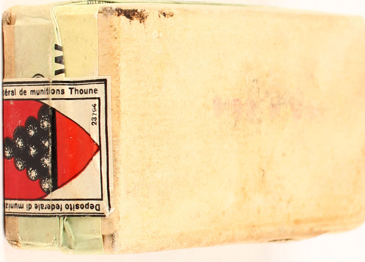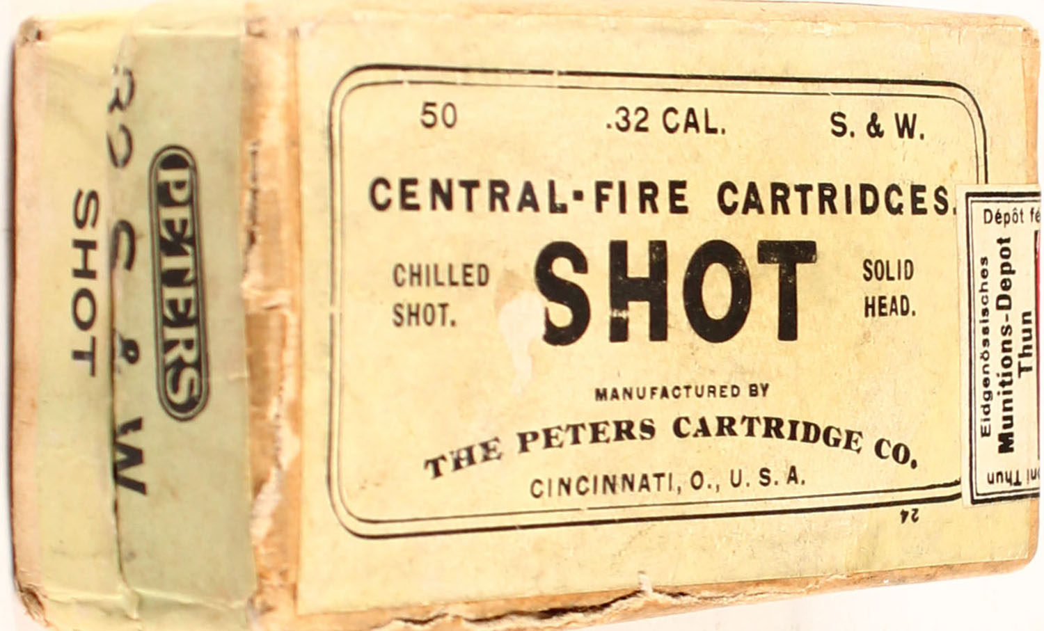 Peters, .32 S.&W., SHOT cartridges, chilled shot, solid head, 2pc, FULL & SEALED, buff box with green label & black print, box is solid with munitions-depot thun sticker on right end, partial tear in one seam on top, light age soiling, light handling wear, light rub marks, & light edge wear. Grade: Very Good ++ - Value: 30 to 90