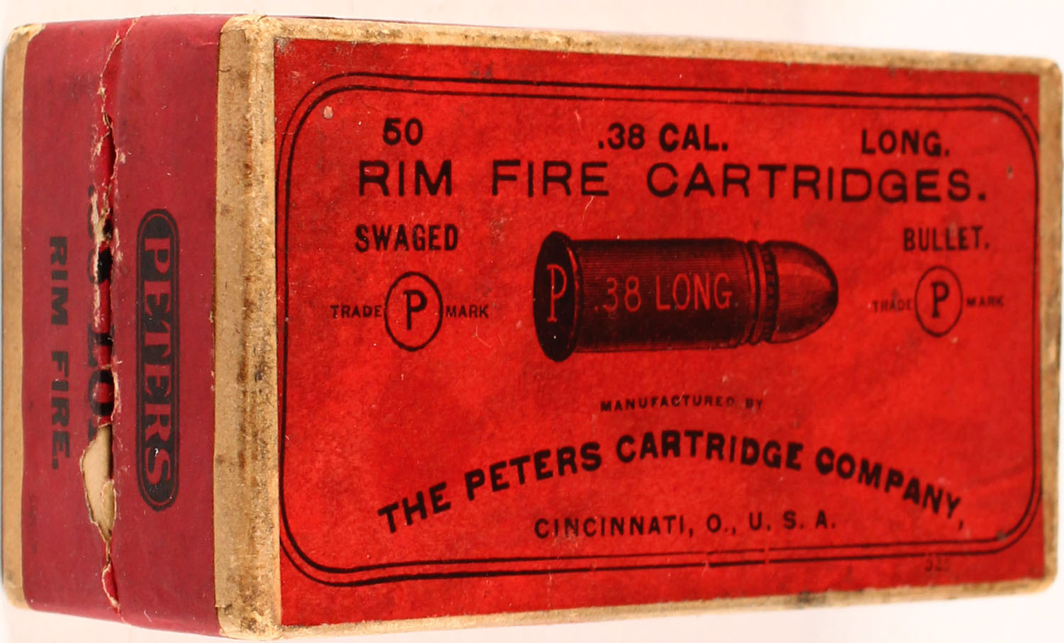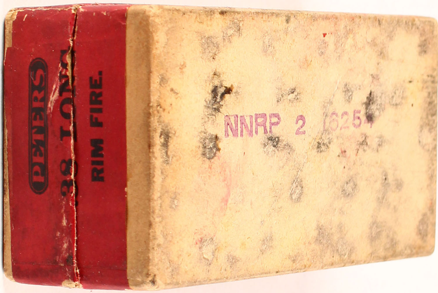 Peters, .38 Long R.F., Swaged Bullet, smokeless powder, 2pc, Full, buff box with red label & black print, box is solid with light age soiling, light rub marks & light edge wear, ammo is fair. Grade: Excellent - Value: 30 to 90