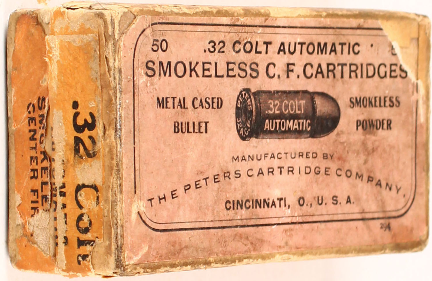 Peters, .32 Colt Automatic, Metal cased Bullet, Smokeless Powder, 2pc, Partial 40 Rds. With mixed H/S, buff box with salmon/orange label & black print, box is solid with four corner seam tears on lid, tear in top label, light age soiling, light rub marks, & edge wear, ammo is very good. Grade: Very Good + - Value: 20 to 60