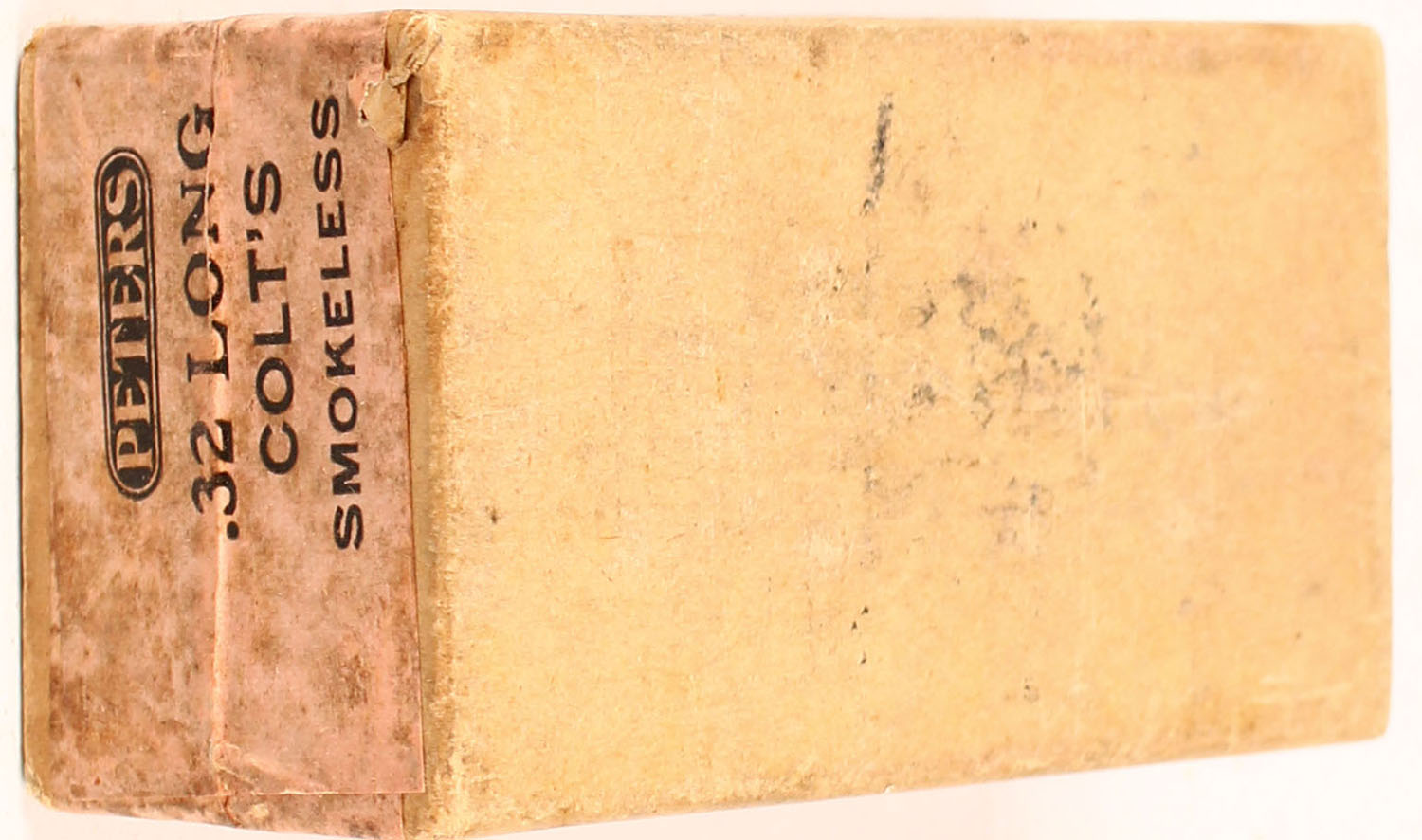 Peters, .32 Long Colt, Smokeless, Solid Head, 2pc, FULL & SEALED, buff box with salmon label & black print, box is solid with age soiling, light rub marks & light edge/corner wear. Grade: Very Good ++ - Value: 14 to 90