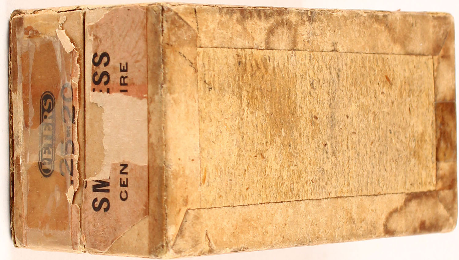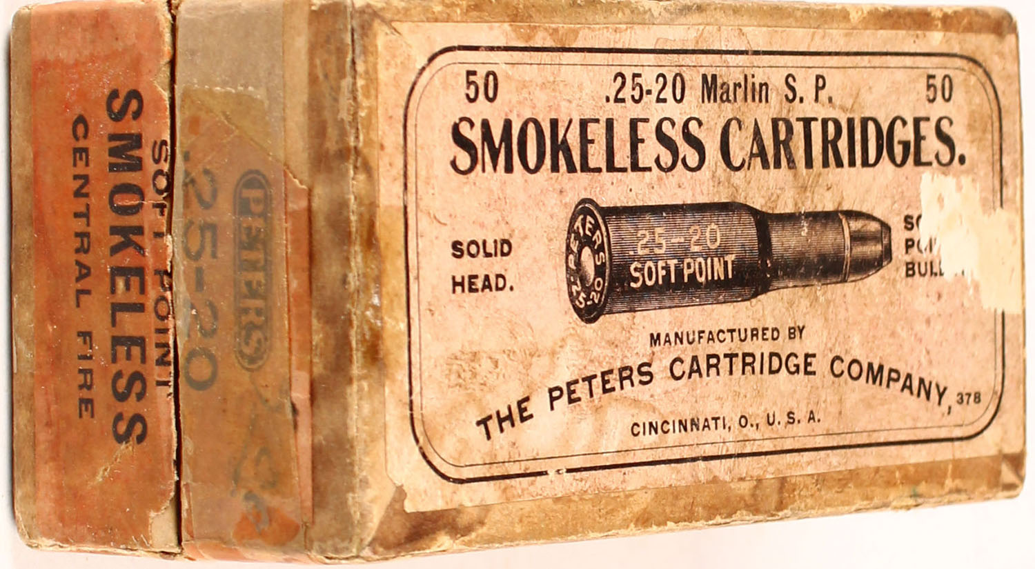 Peters, .25-20 Marlin, Soft Point Bullet, Smokeless, 2pc, Full, buff box with salmon label & black print, box is solid with part of back side label fallen off but still present & inside box, tape, faint pencil marks, tears in label's, age soiling, rub marks, & edge/corner wear, ammo is very good. Grade: Very Good - Value: 80 to 160