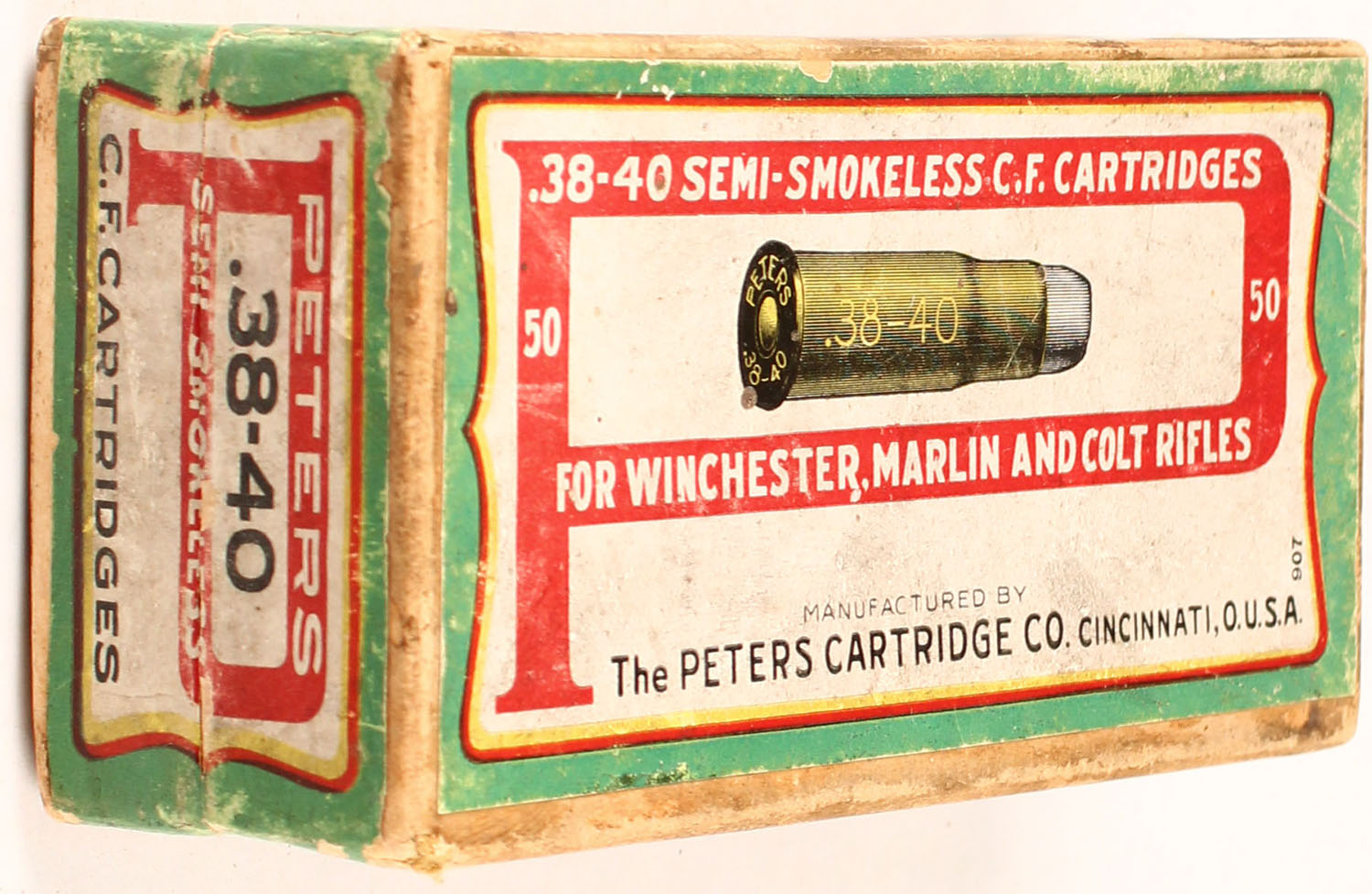 Peters, .38-40, Semi-Smokeless Powder, 2pc, Full, buff box with green/red/white box & black print, box has two split corner seams on lid, light age soiling, rub marks, & edge wear, ammo ranges from very good to good. Grade: Very Good ++ - Value: 60 to 120