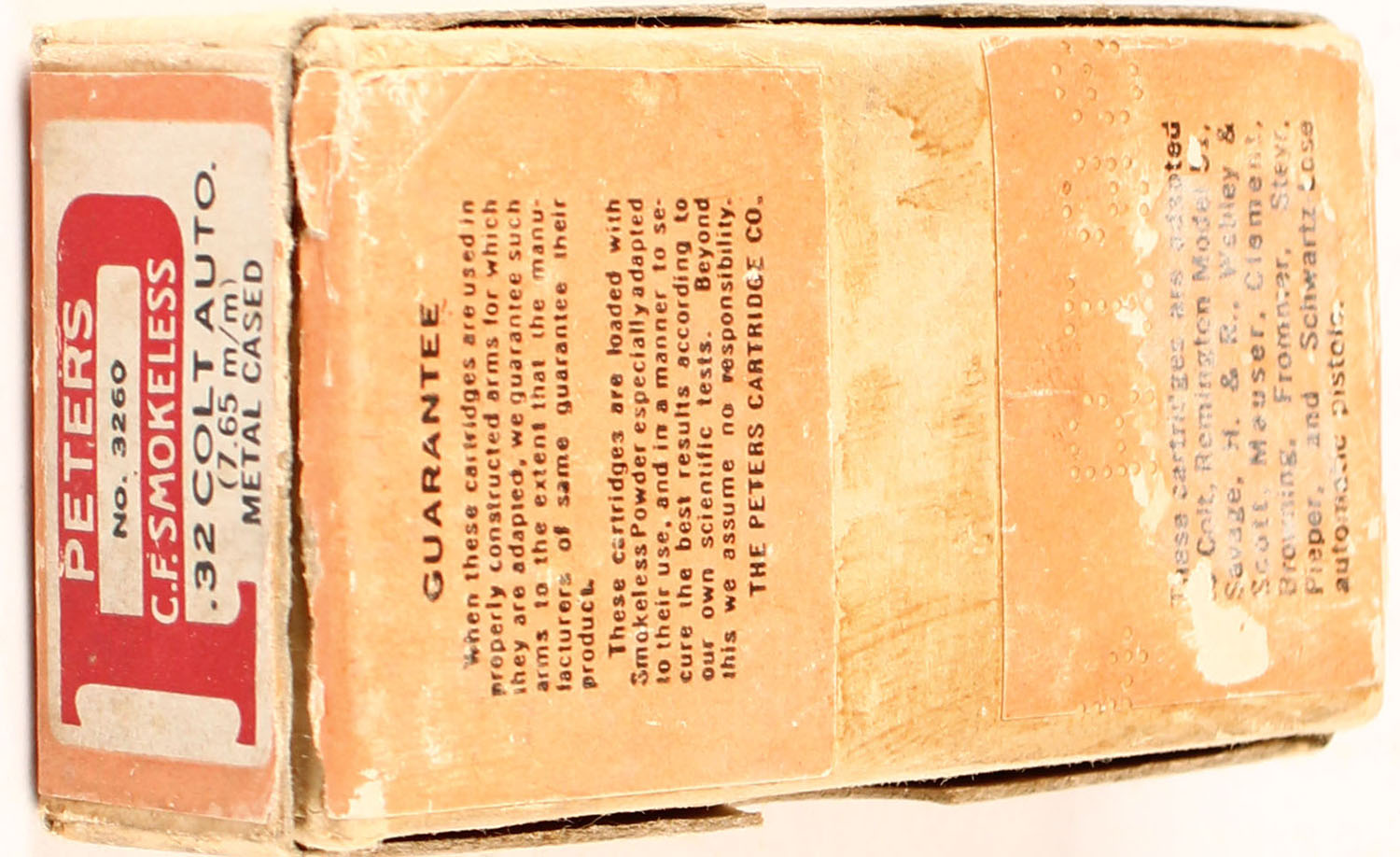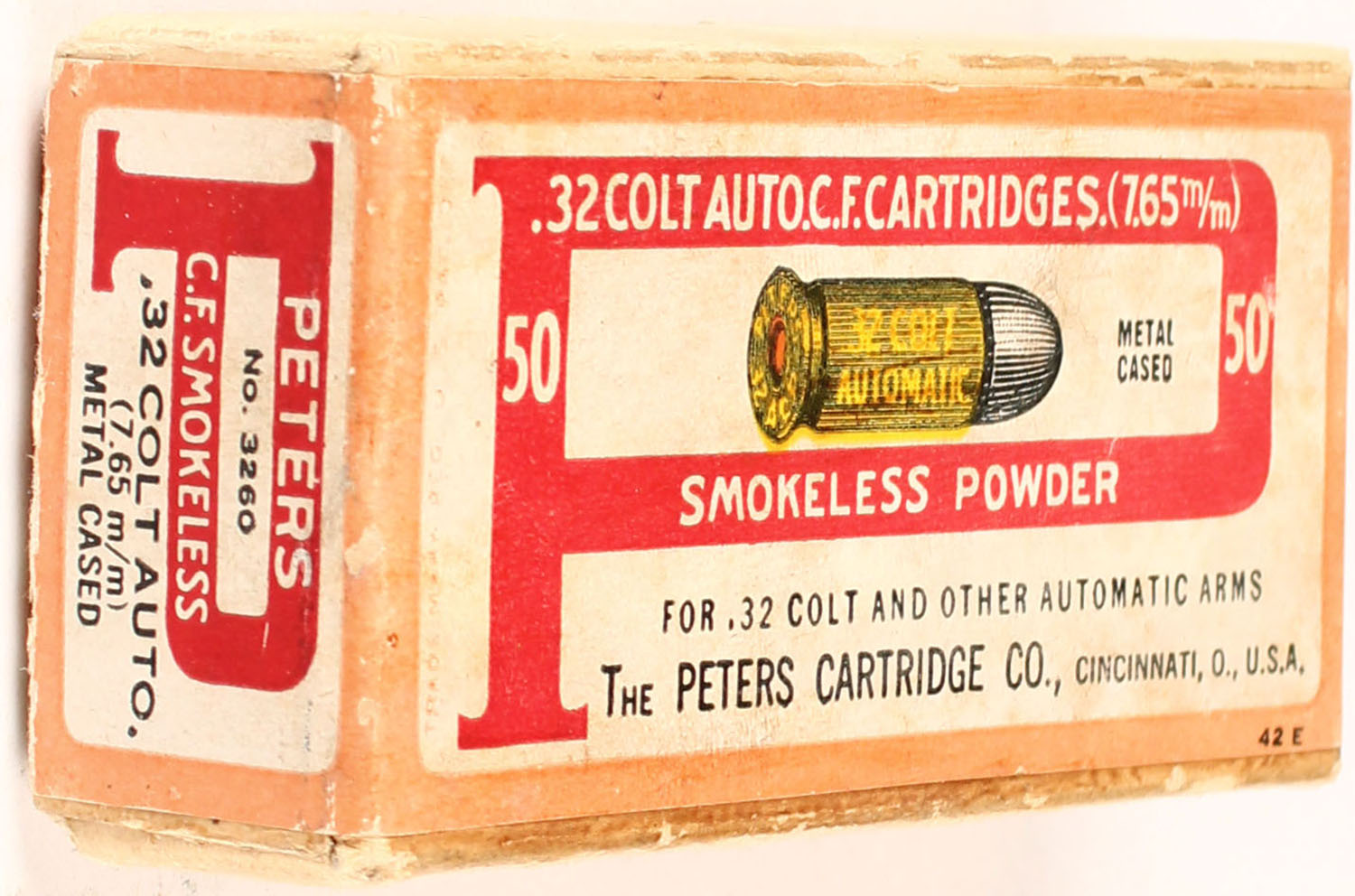 Peters, .32 Colt Automatic, Metal cased Bullet, Smokeless Powder, 2pc, Full, buff box with salmon/white/red label & black print, box is solid with rub marks & light edge wear, ammo is very good. Grade: Excellent - Value: 20 to 60