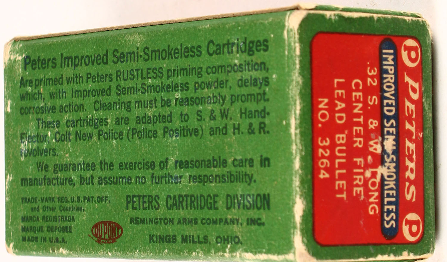 Peters, .32 S.&W. Long, Lead Bullet, Improved Semi-Smokeless Powder, 1pc, Full, green box with red/blue label & white print, box is solid with rub marks, edge/corner wear, & handling wear, ammo is very good. Grade: Very Good ++ - Value: 40 to 120
