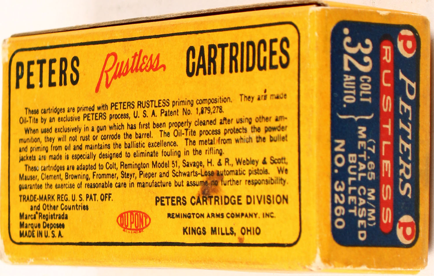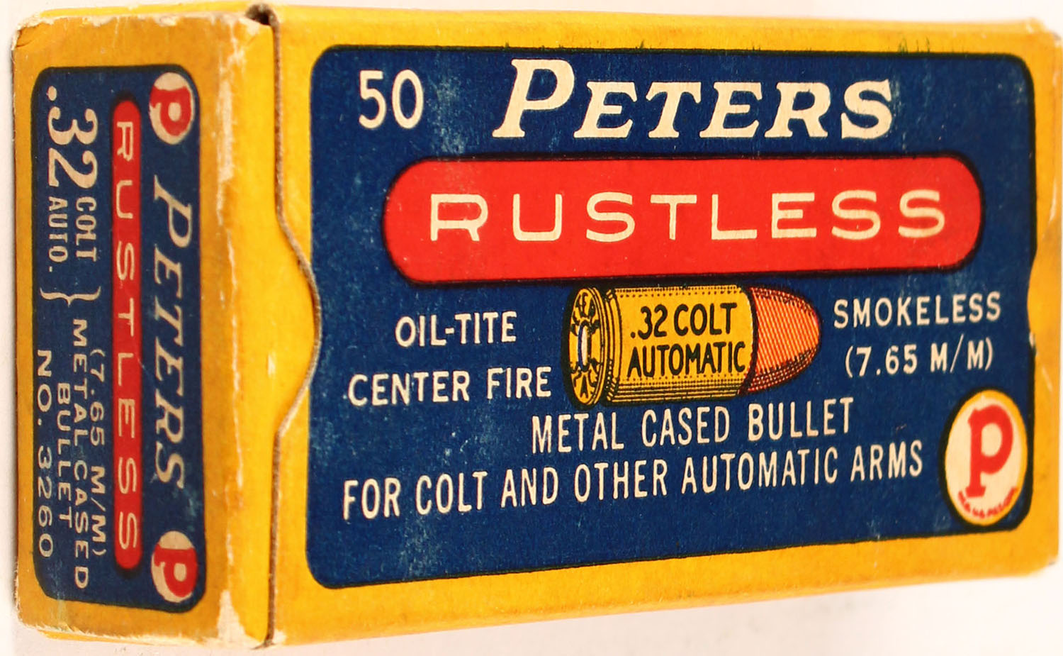 Peters, Rustless, .32 Colt Automatic, Metal Cased Bullet, Smokeless, Oil-Tite, 1pc, Full, yellow box with blue/red label & white print, box is solid with pencil marks, & light rub wear, ammo is very good. Grade: Excellent - Value: 40 to 160