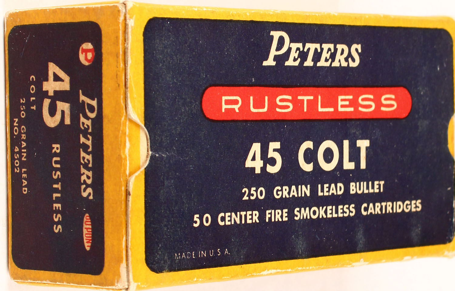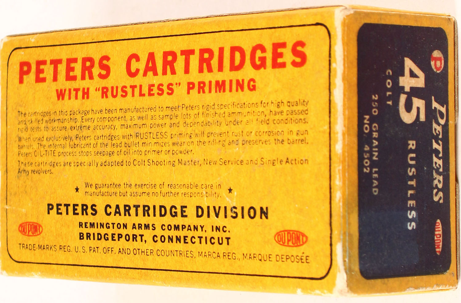 Peters, Rustless, .45 Colt, 250 Gr. lead bullet, smokeless, 1pc, Full, yellow box with blue label & white print, box is solid with light age soiling, light rub marks & light edge wear, ammo is excellent. Grade: Excellent - Value: 70 to 140