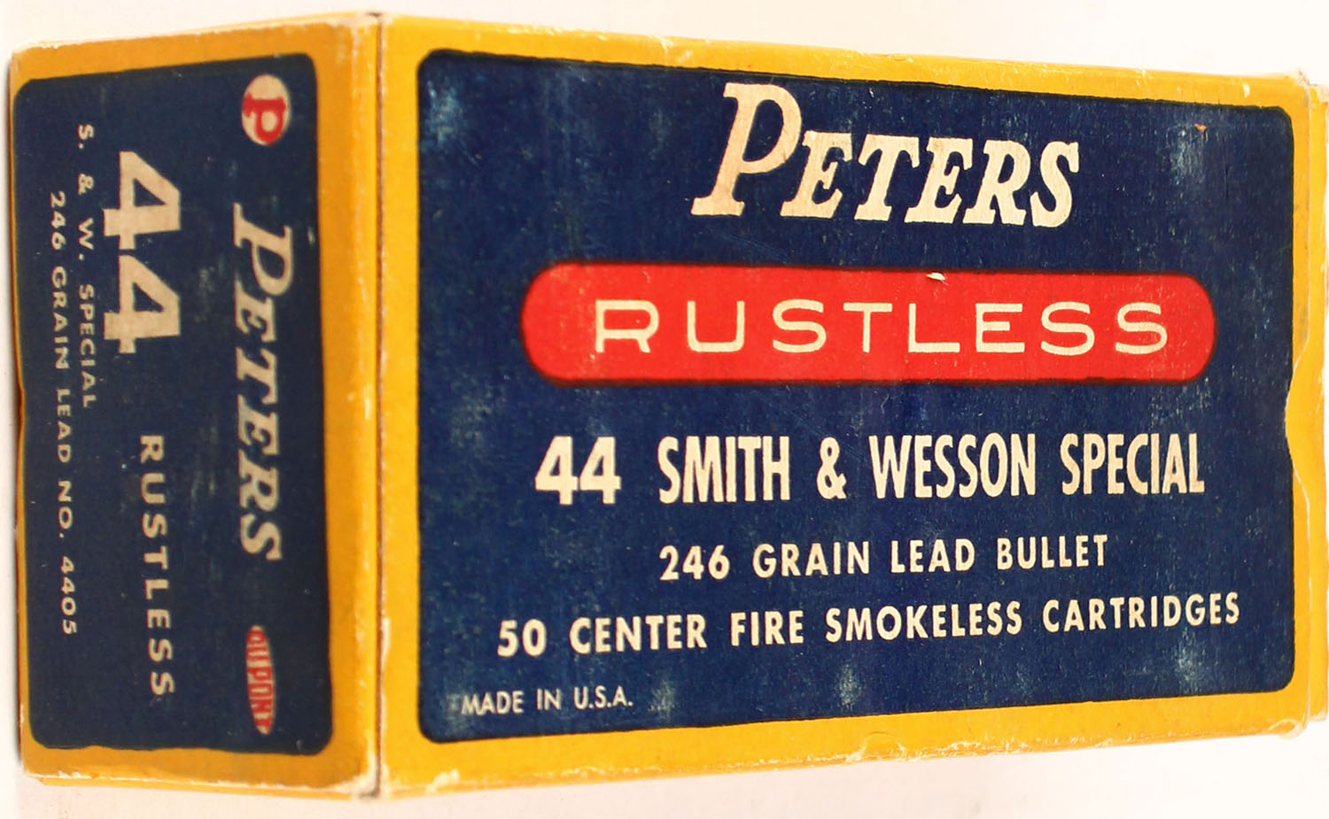 Peters, Rustless, .44 S.&W. Special, 246 Gr. Lead Bullet, Smokeless, 1pc, Full, yellow box with blue/red label & white print, box is solid with rub wear, & light edge/corner wear, ammo is excellent. Grade: Excellent + - Value: 30 to 60