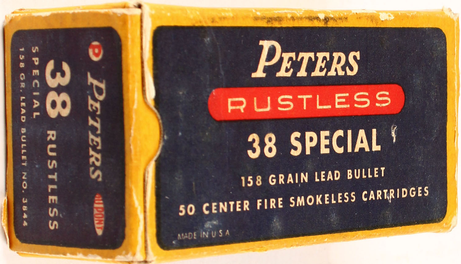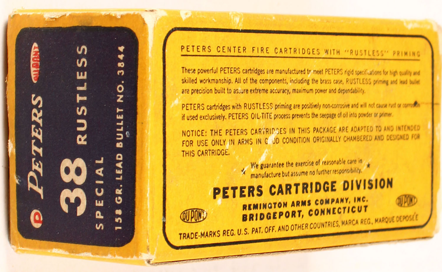 Peters, Rustless, .38 Special, 158 Gr. Lead Bullet, Smokeless, 1pc, Full, yellow box with blue/red label & white print, box is solid with light age soiling, light rub wear & light edge wear, ammo is Excellent. Grade: Very Good ++ - Value: 50 to 100
