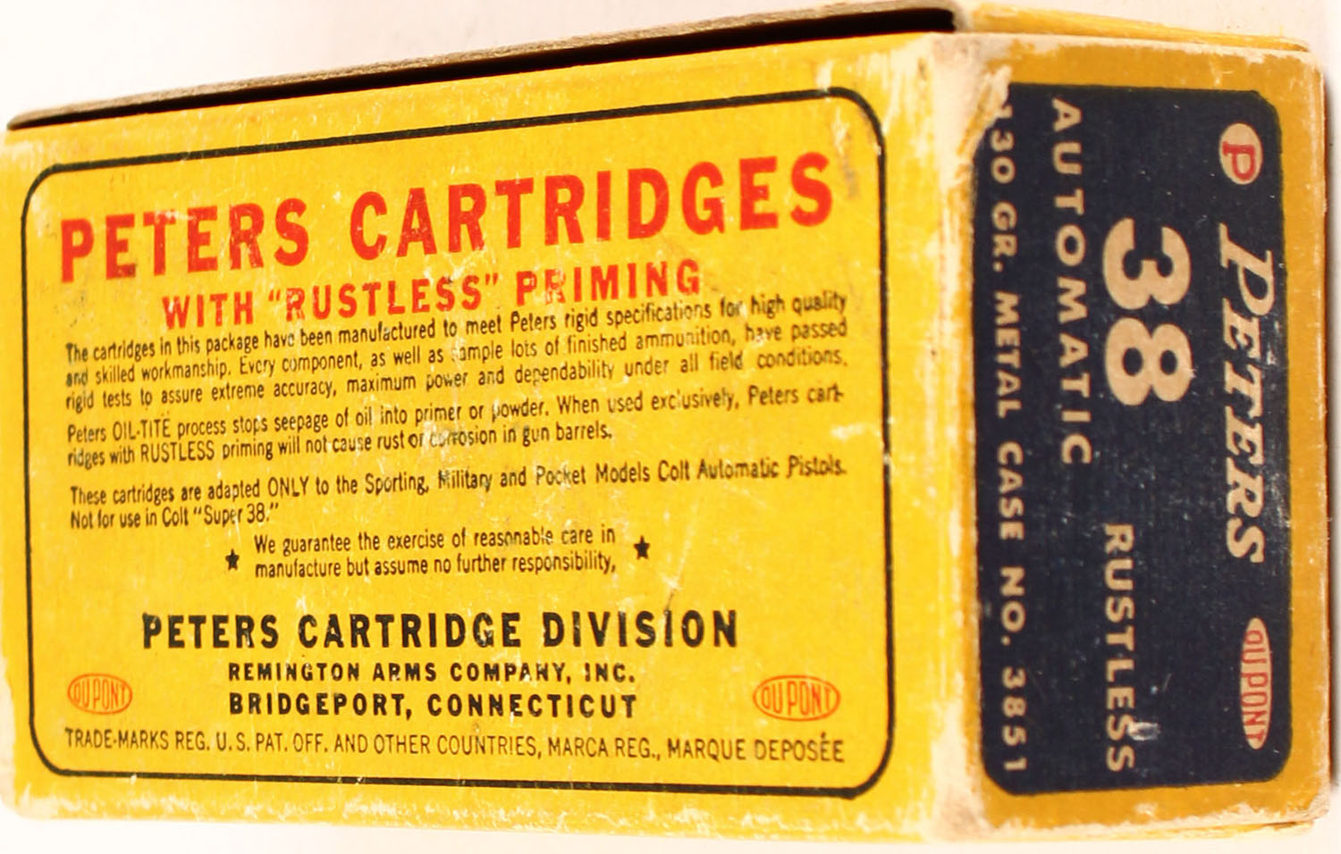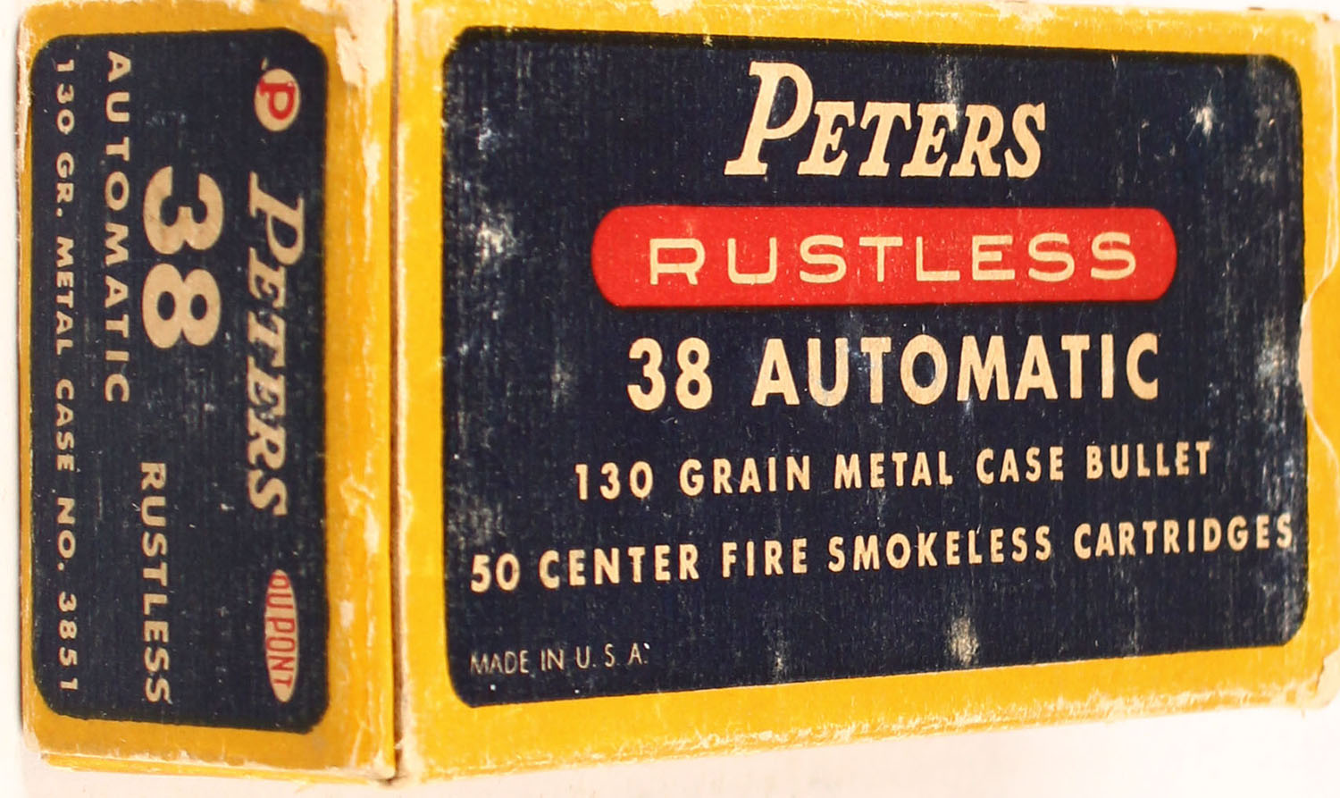 Peters, Rustless, .38 Automatic, 130 Gr. metal case bullet, smokeless, 1pc, Full, yellow box with blue/red label & white print, box is solid with rub marks, & edge wear, ammo is very good. Grade: Very Good ++ - Value: 30 to 90