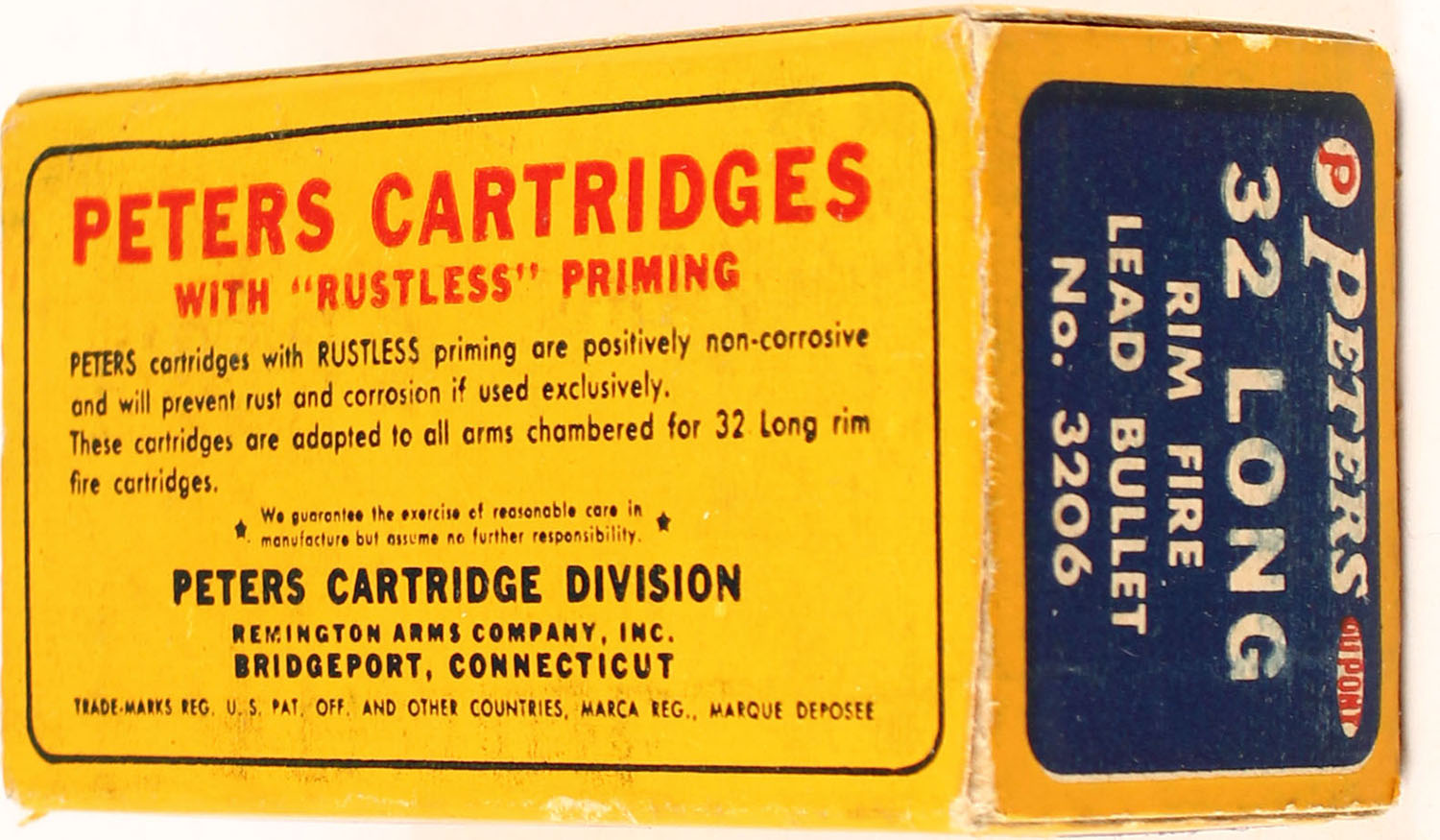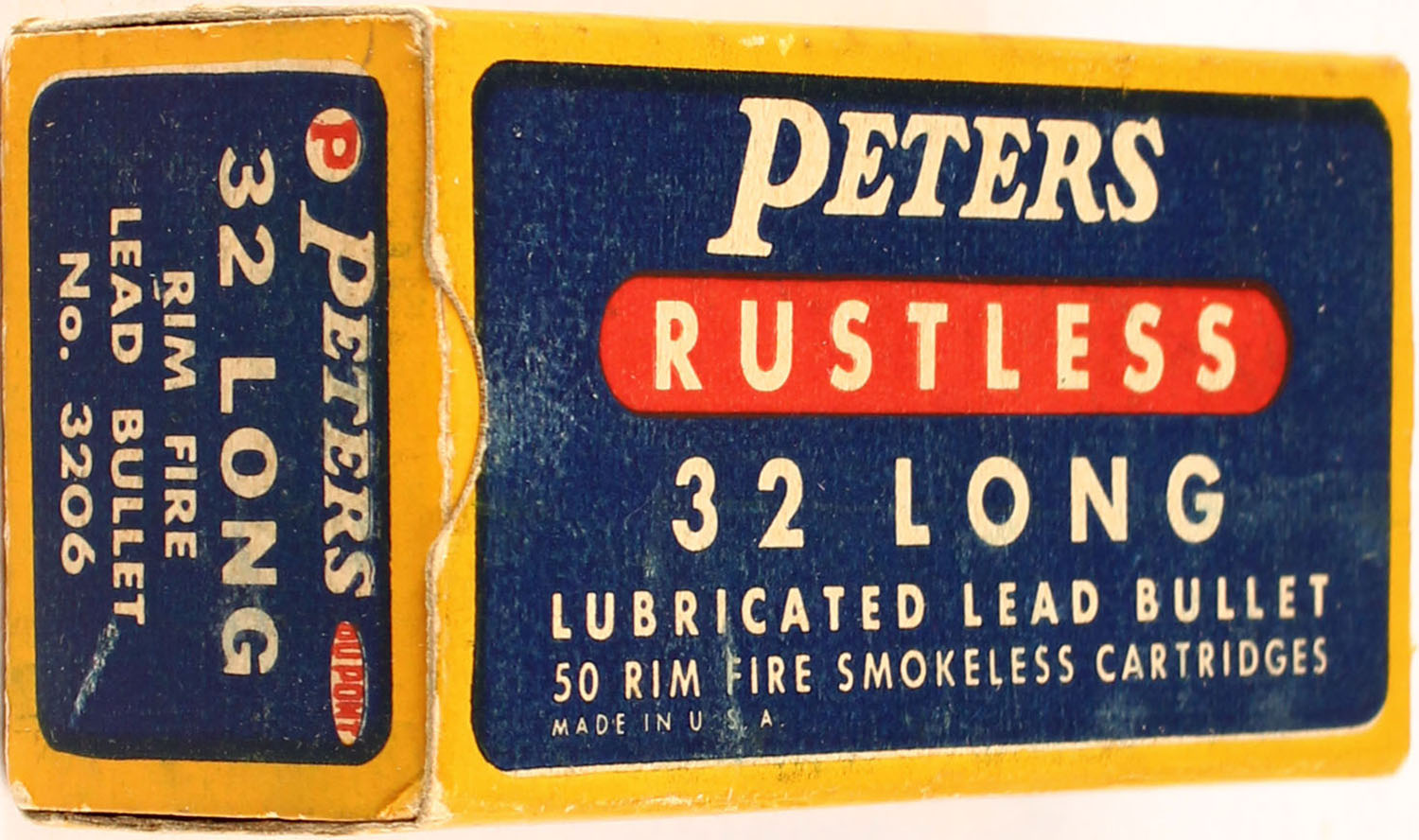 Peters, Rustless, .32 Long R.F., Lubricated Lead Bullet, Smokeless, 1pc, Full, yellow box with blue/red label & white print, box is solid with rub marks, ammo is excellent. Grade: Excellent + - Value: 30 to 200