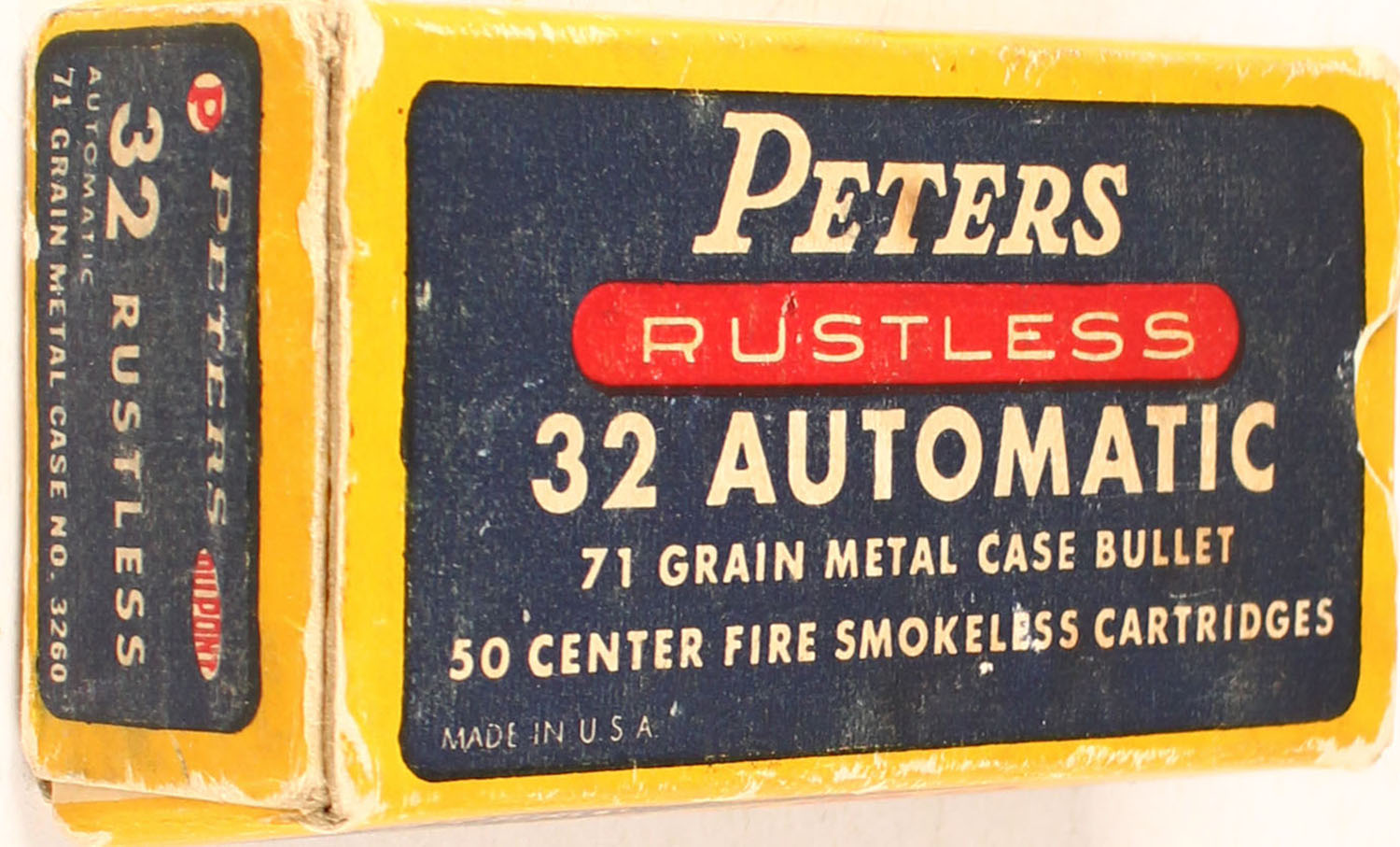 Peters, Rustless, .32 Automatic, 71 Gr. metal cased bullet, smokeless, 1pc Full, yellow box with blue/red label & white print, box is solid with factory seam that has come undone, rub marks, & edge/corner wear, ammo is very good. Grade: Very Good + - Value: 30 to 60