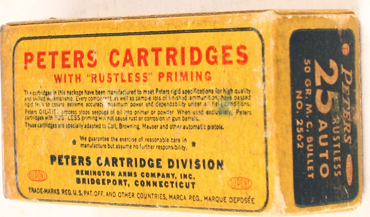 Peters, Rustless, .25 Automatic, 50 Gr. Metal cased bullet, smokeless, 1pc, partial 40 Rds., yellow box with blue/red label & white print, box is solid with light age soiling, rub marks, & light edge wear, ammo is very good. Grade: Very Good ++ - Value: 14 to 90