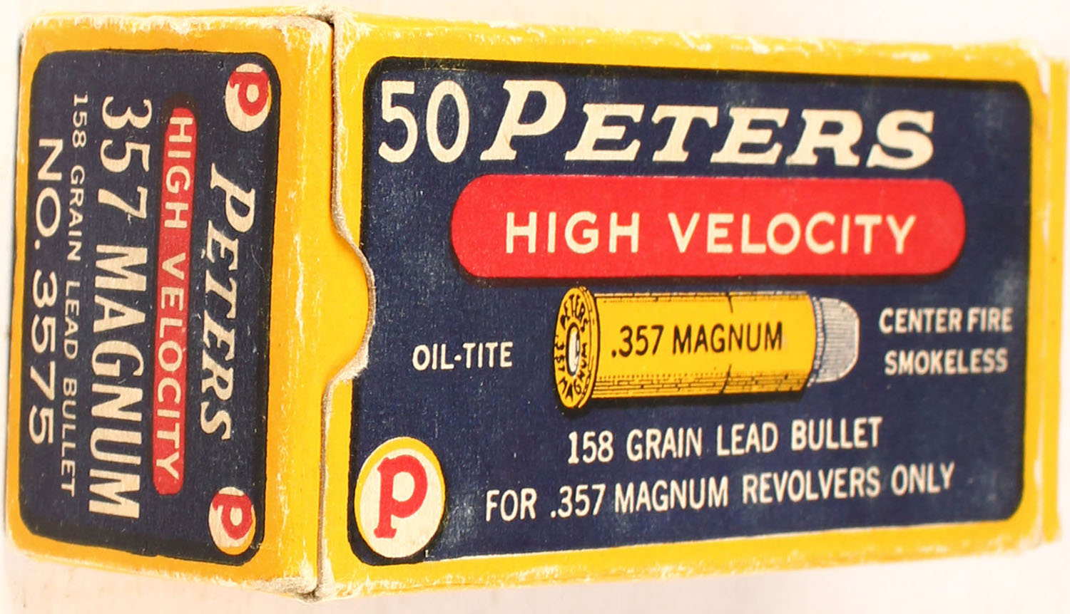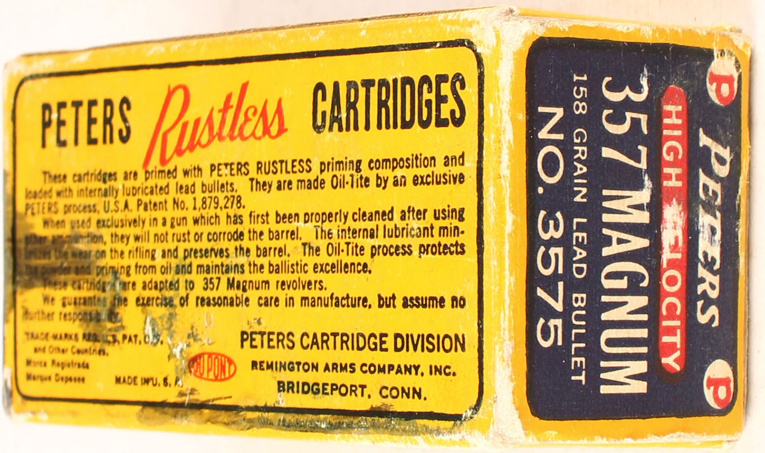 Peters, High Velocity, .357 Magnum, 158 Gr. Lead Bullet, smokeless, OIL-TITE, 1pc, Full, yellow box with blue/red label & white print, box is solid with stains on bottom, light rub marks, & light edge wear, ammo is excellent. Grade: Very Good ++ - Value: 40 to 120
