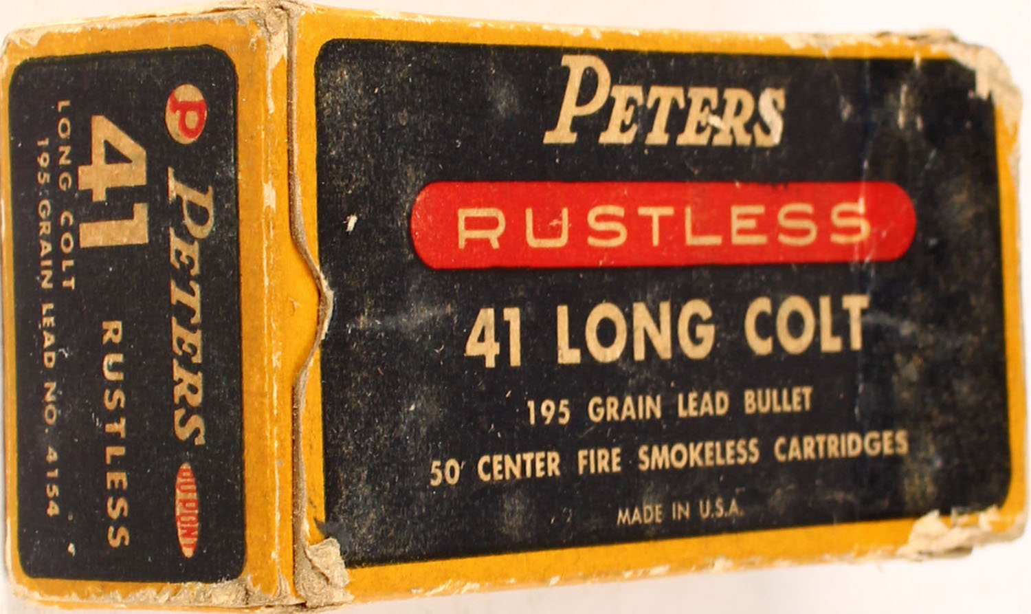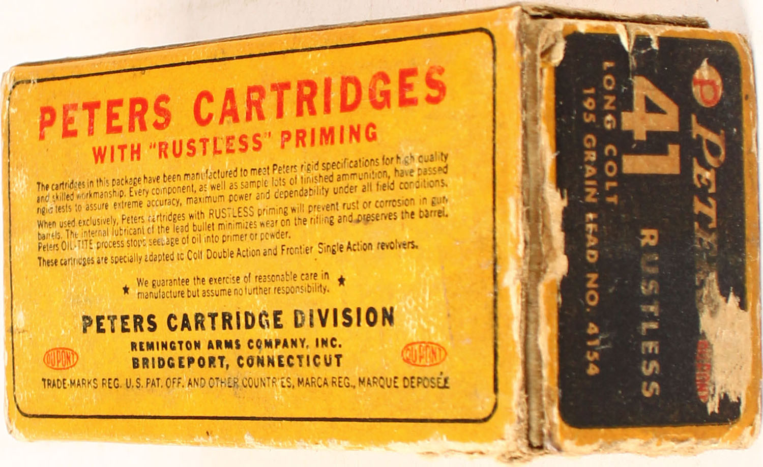 Peters, Rustless, .41 Long Colt, 165 Gr. Lead Bullet, smokeless, 1pc, Full, yellow box with blue/red label & white print, box has right end flap tab missing, both right end inside flaps missing, sticker mark on back, light age soiling, rub marks & edge/corner wear, ammo is very good. Grade: Good ++ - Value: 80 to 160