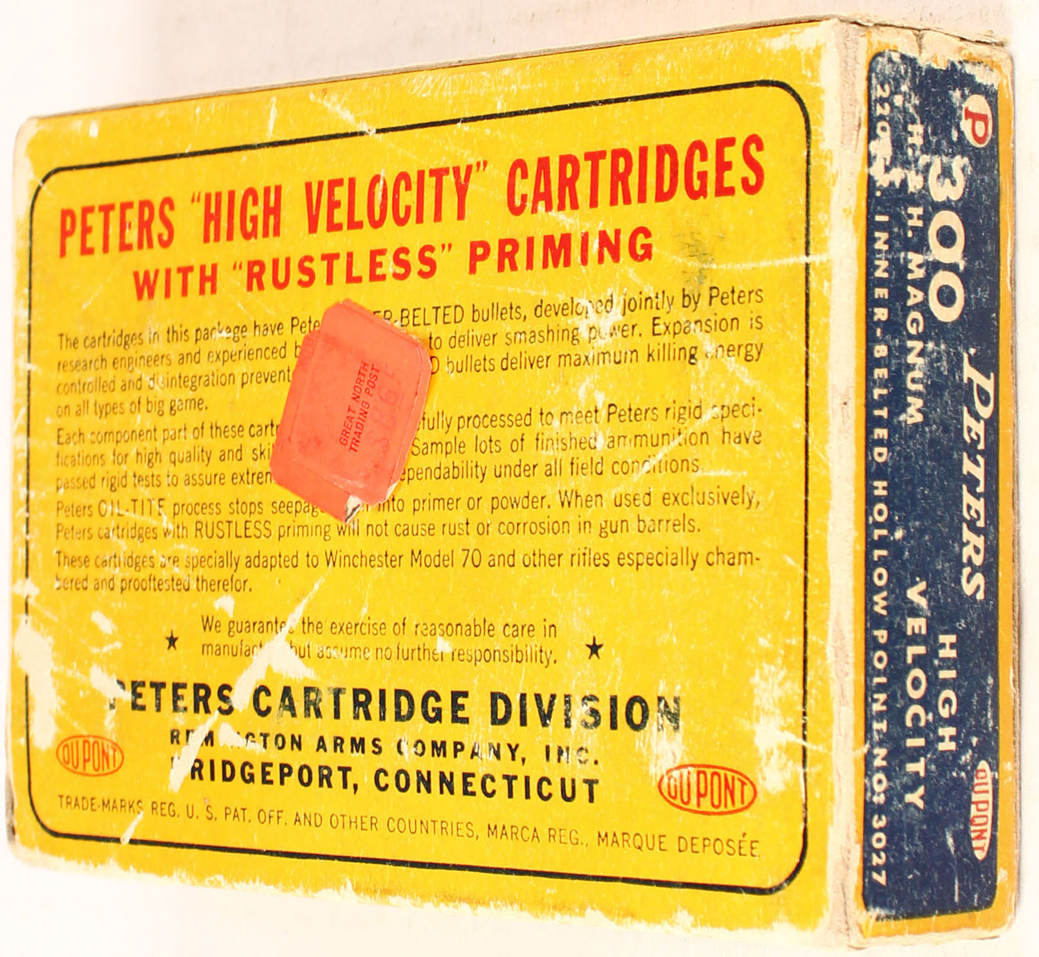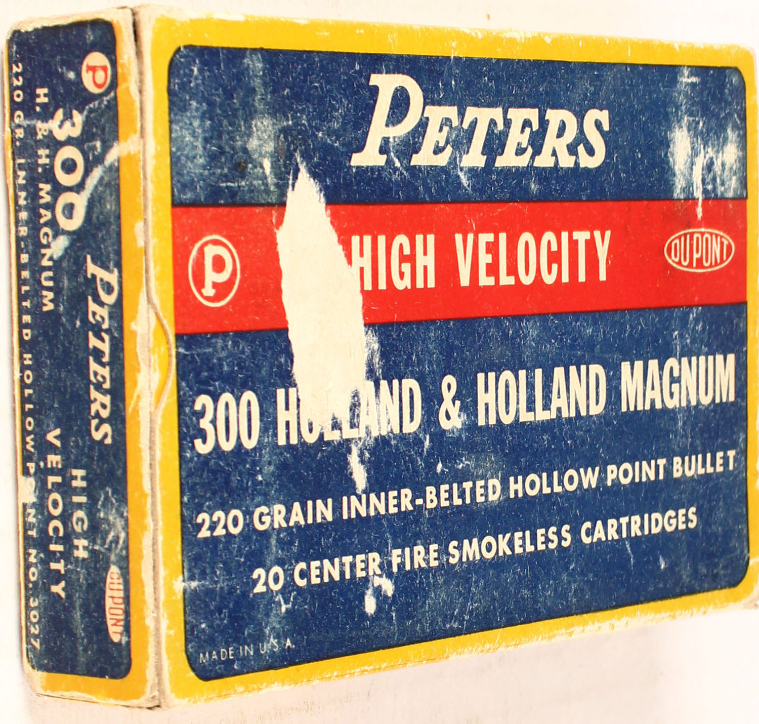Peters, High Velocity, .300 H&H Magnum, 220 Gr. Inner-Belted Hollow point bullet, smokeless, 1pc, Partial 16 Rds., yellow box with blue/red label & white print, box has all four inside end flaps missing, tear in front label, stickers on back, rub marks, edge/corner wear, end flap seams are weak, ammo is very good. Grade: Very Good + - Value: 60 to 120