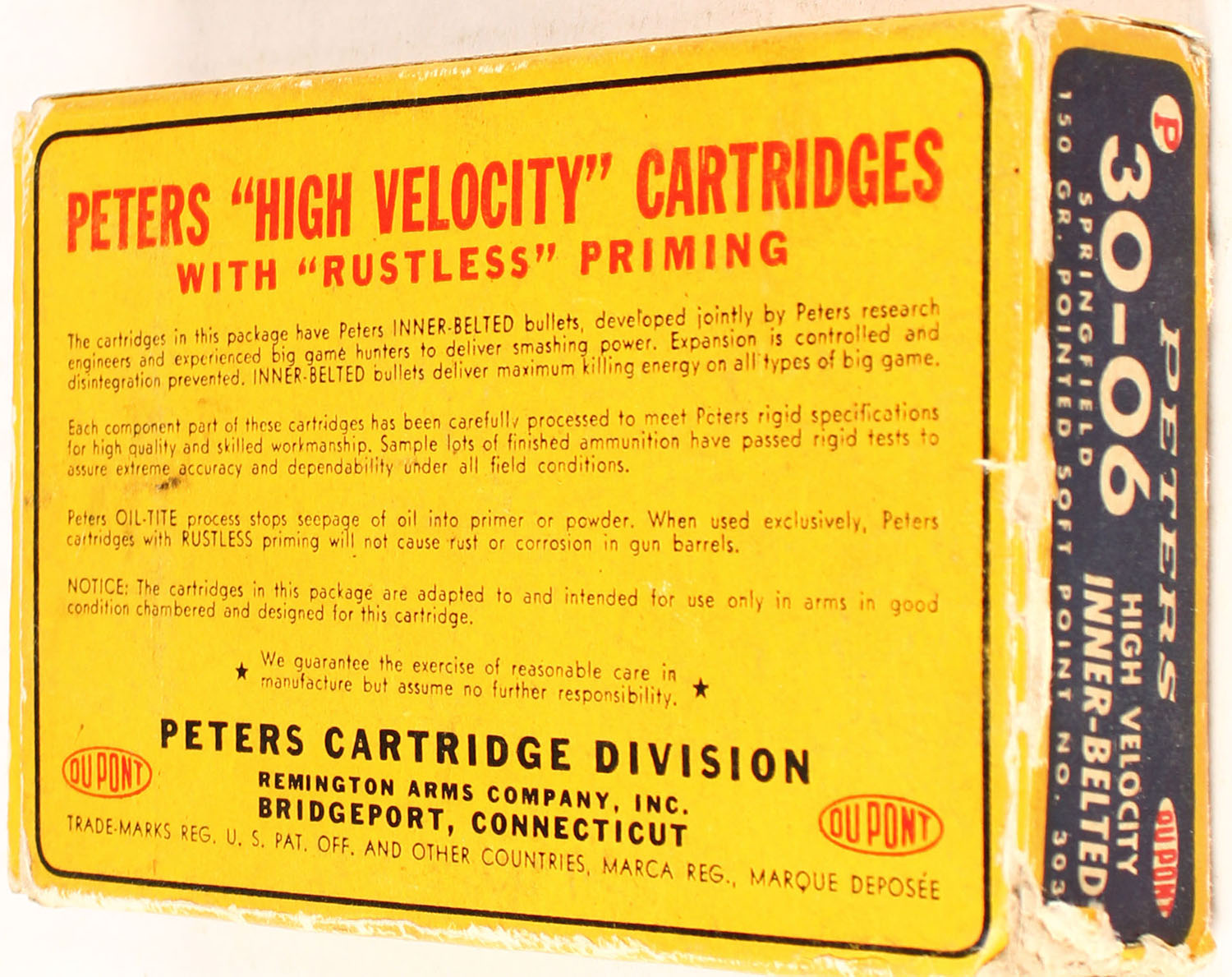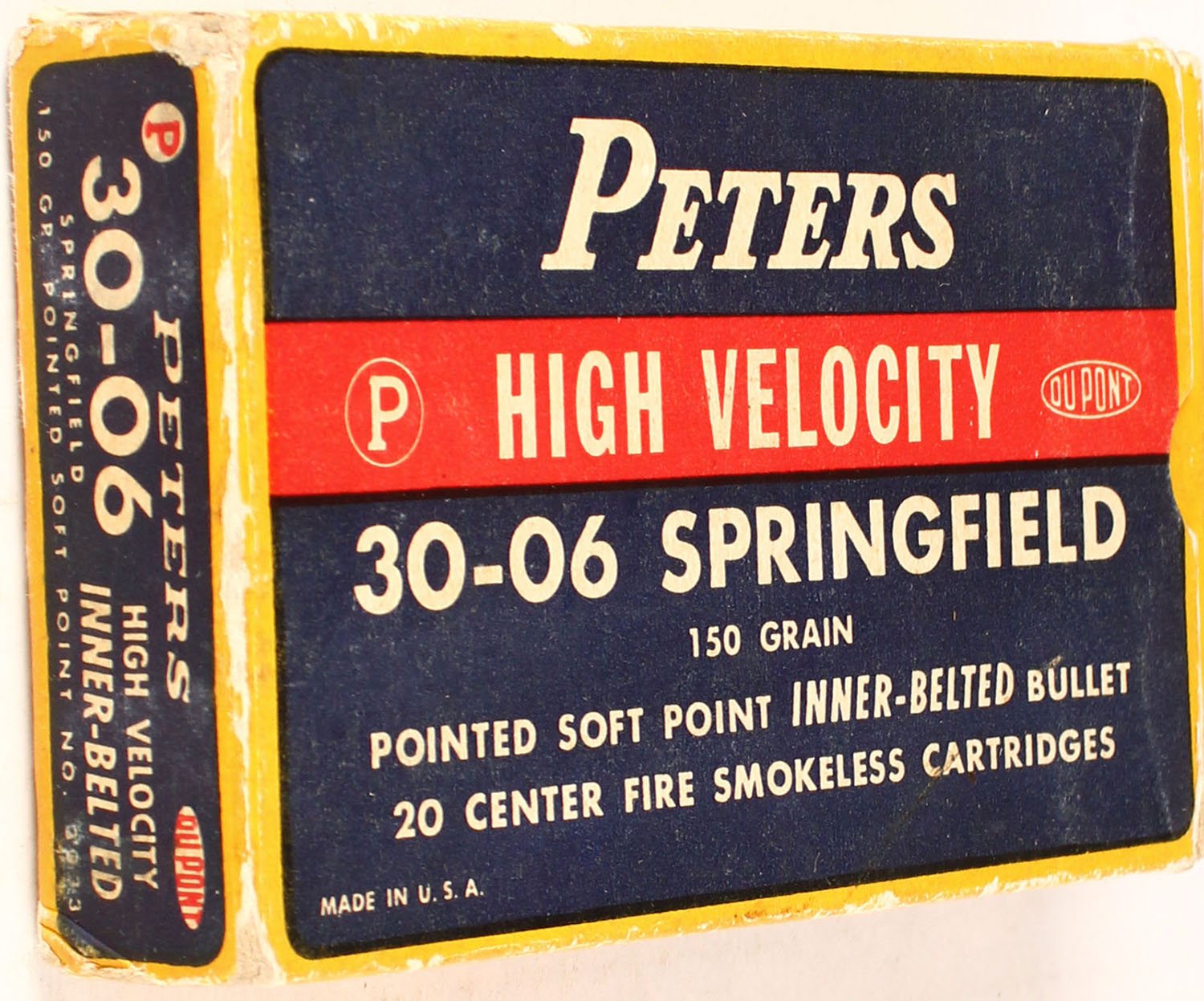 Peters, High Velocity, .30-06 Springfield, 160 Gr. Pointed soft point Inner-Belted bullet, smokeless, 1pc, Partial 19 Rds., two correct Rds. & the rest have ''R-P'' headstamp, yellow box with blue/red label & white print, box is solid with both right inner end flaps missing, pen marks, light rub marks, & edge/corner wear, ammo is excellent. Grade: Very Good + - Value: 20 to 60