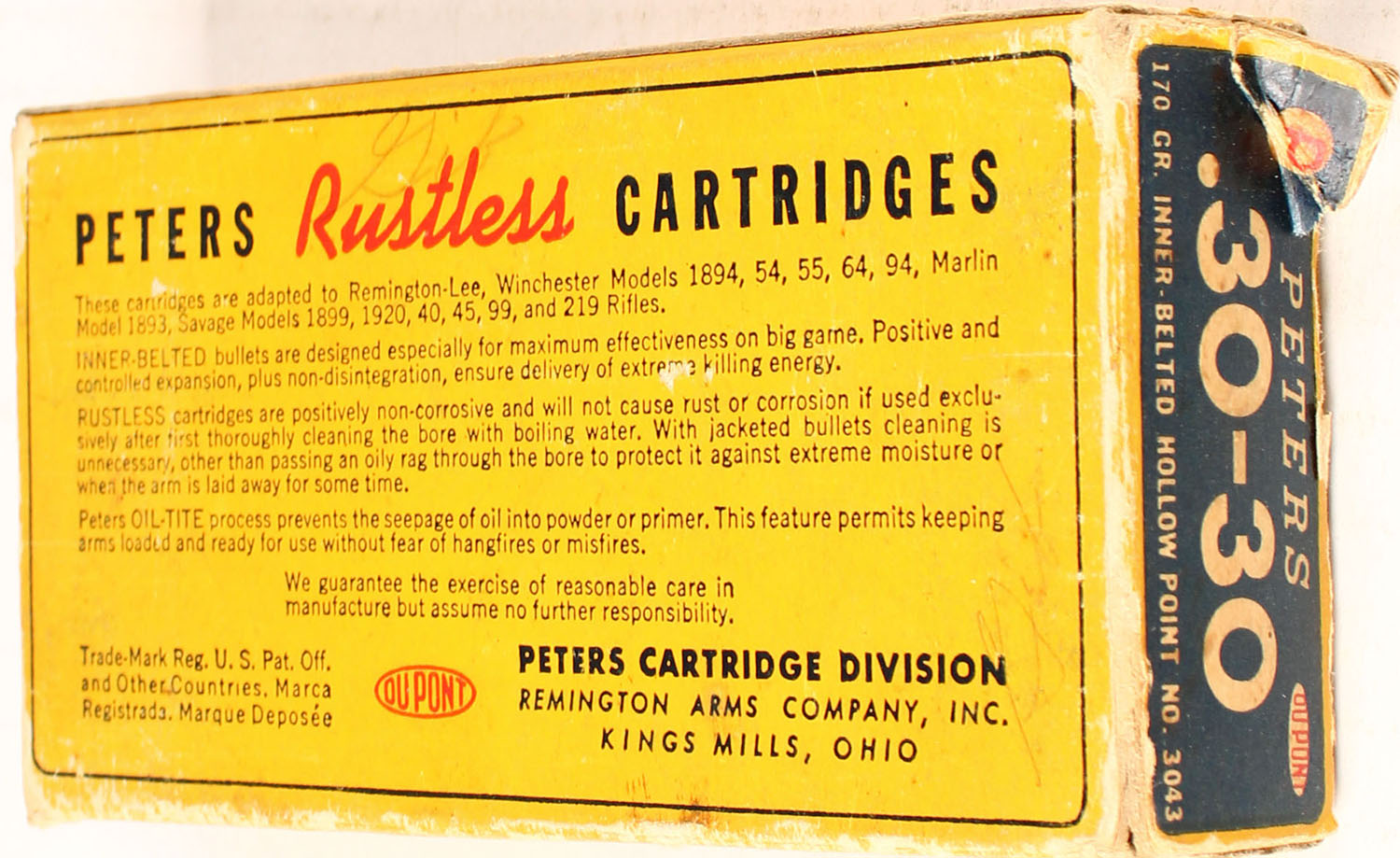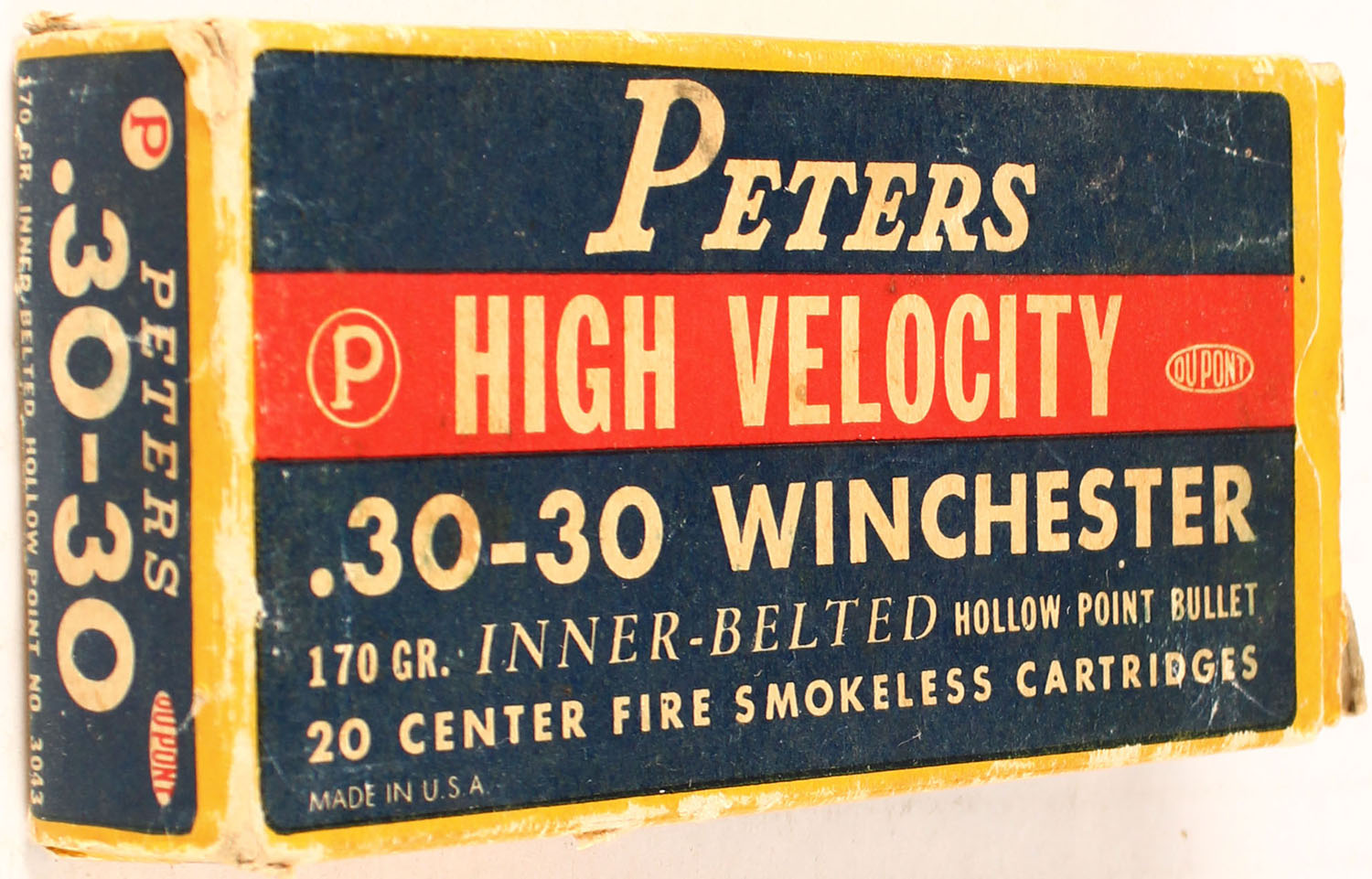 Peters, High Velocity, .30-30 Winchester, 170 Gr. Inner-Belted Hollow point bullet, smokeless, 1pc, Full, has one Rd. of Super-X inside, yellow box with blue/red label & white print, box has both right inner end flaps missing, one left inner end flap missing, pencil marks, tear in right end flap, rub marks & edge wear, ammo is excellent. Grade: Very Good + - Value: 20 to 60