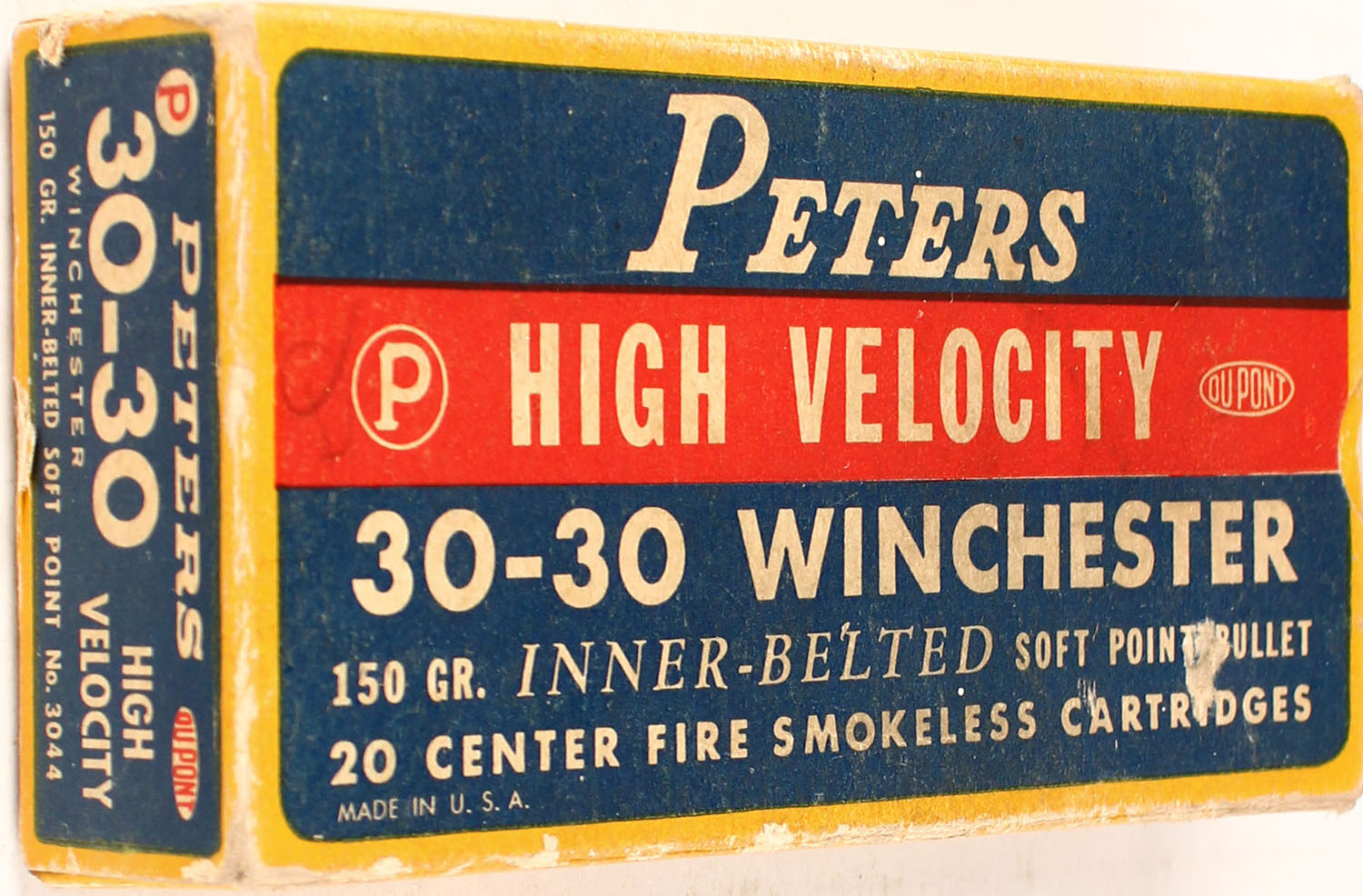 Peters, High Velocity, .30-30 Winchester, 150 Gr. Inner-Belted soft point bullet, smokeless, 1pc, Partial 17 Rds. 8 correct, yellow box with blue/red label & white print, box is missing both inner right side end flaps, pencil marks, rub marks & edge/corner wear, ammo is good. Grade: Very Good ++ - Value: 20 to 60