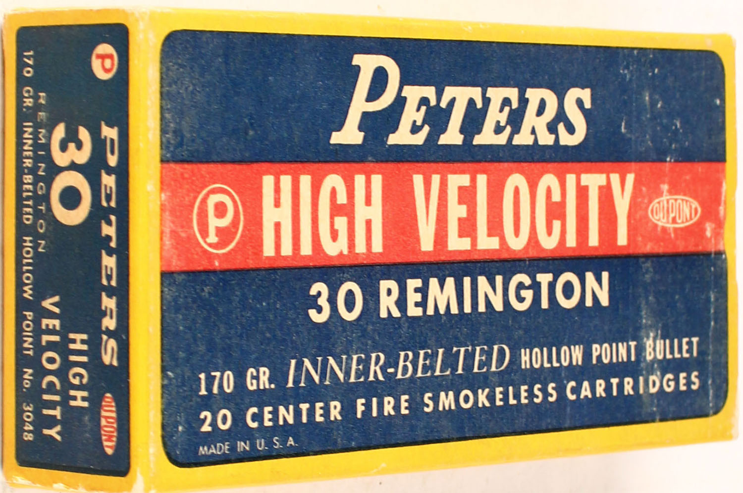Peters, High Velocity, .30 Remington, 170 Gr. Inner-Belted Hollow Point Bullet, smokeless, 1pc, Full, yellow box with blue/red label & white print, box is solid with rub marks & light corner wear, ammo is excellent. Grade: Excellent + - Value: 80 to 160