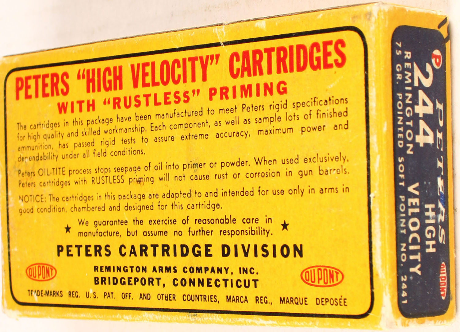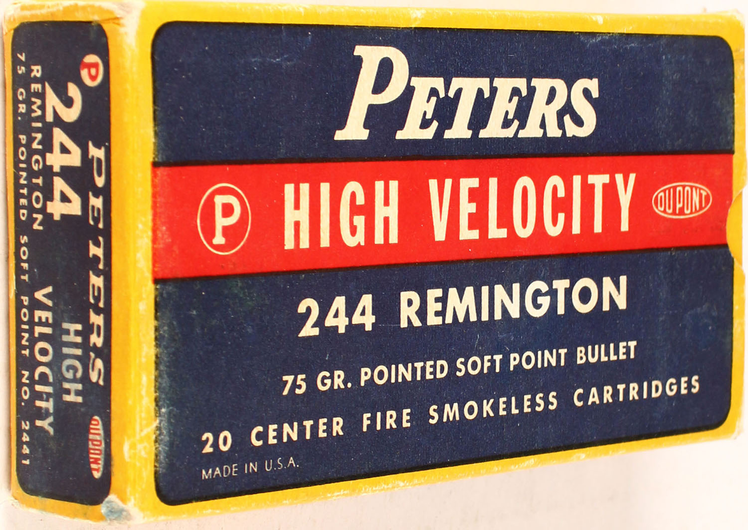 Peters, High Velocity, .244 Remington, 75 Gr. Pointed soft point bullet, smokeless, 1pc, partial 19 Rds. yellow box with blue/red label & white print, box is solid with light rub marks & light edge/corner wear, ammo is very good. Grade: Excellent + - Value: 60 to 120
