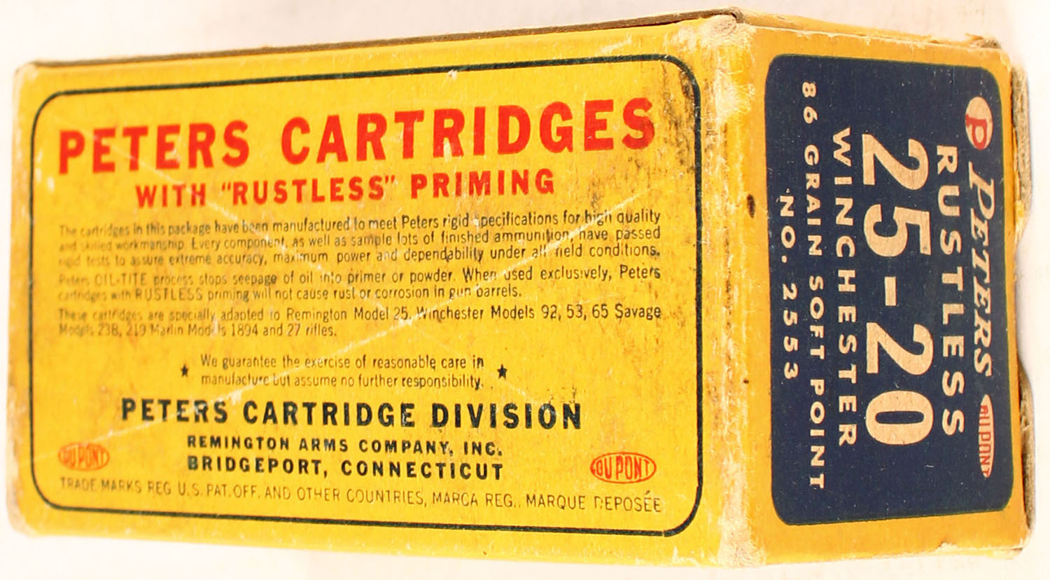 Peters, Rustless, .25-20 Winchester, 86 Gr. Soft Point Bullet, smokeless, 1pc, Full, yellow box with blue/red label & white print, box is solid with light age soiling, light rub marks, & edge/corner wear, ammo is very good. Grade: Excellent - Value: 100 to 200